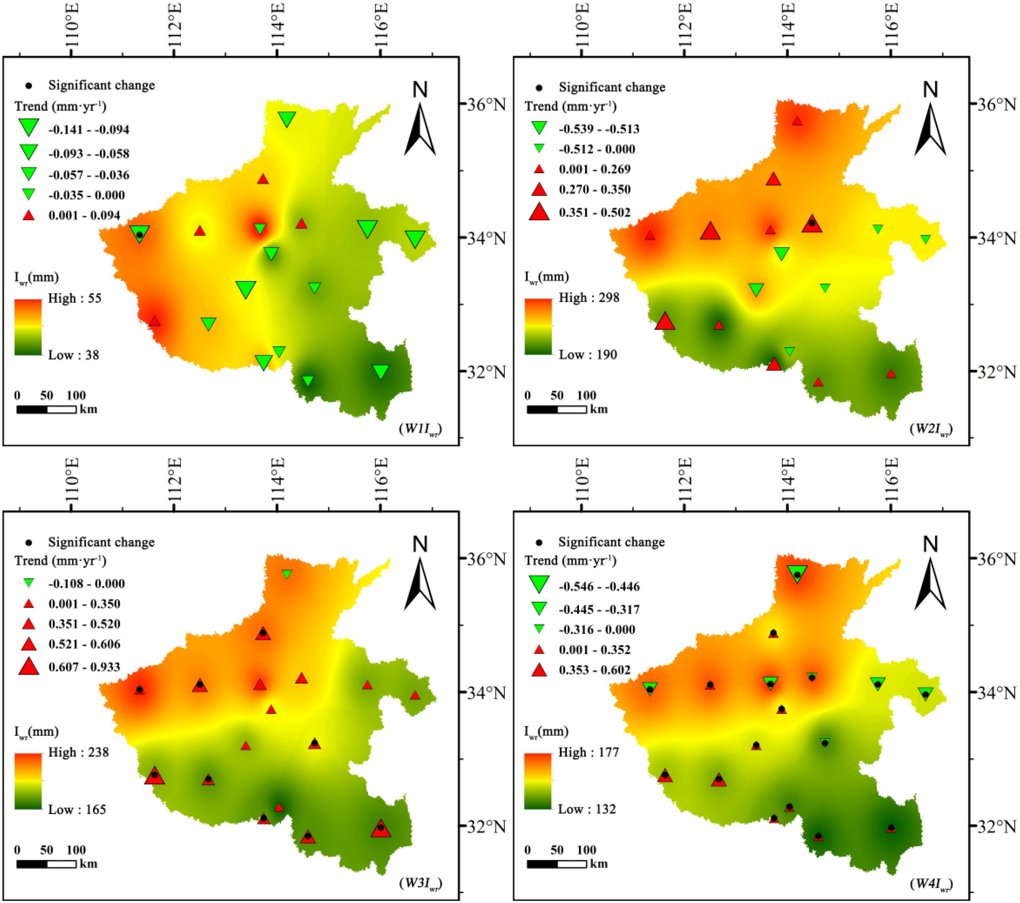 In contrast, winter wheat exhibited more complex and spatially heterogeneous patterns. During the early growth stage (W1Iwr), most regions showed a declining trend, reflecting generally favorable moisture conditions during early winter. However, at the critical development stage (W2Iwr), the pattern diverged sharply: while several regions, especially in central Henan, experienced a significant increase (|Z| > 1.96), others exhibited notable decreases. This spatial polarization reflects growing disparities in water supply–demand relationships across different subregions. During the mid-growth stage (W3Iwr), the overall trend shifted towards increasing irrigation demand, implying a sustained intensification of water stress during this critical phase.