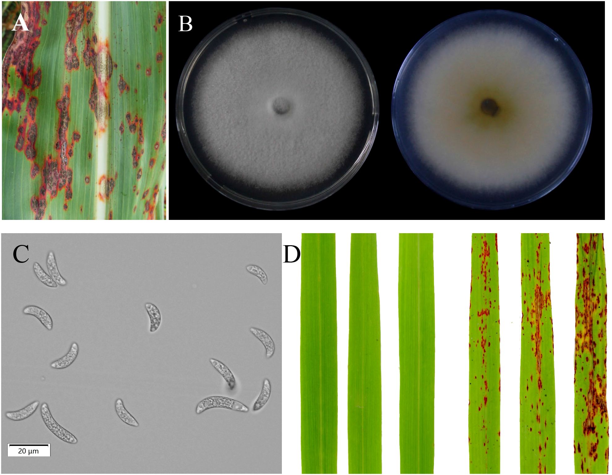 Panel A shows a plant leaf with red lesions. Panel B displays two petri dishes with fungal colonies of different growth patterns. Panel C is a microscopic view of crescent-shaped fungal spores. Panel D shows six plant leaves, three healthy and three with red lesions.