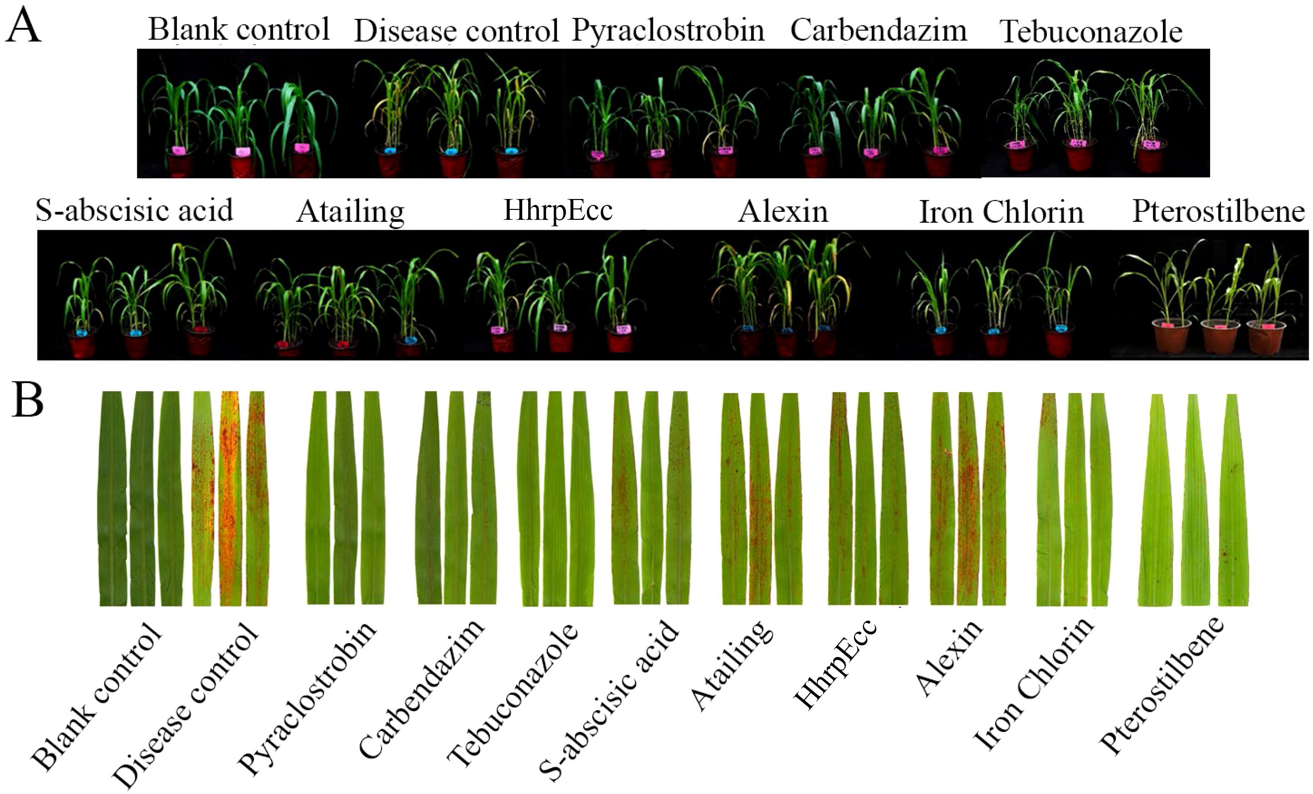 Panel A displays various potted plants under different treatments: blank control, disease control, pyraclostrobin, carbendazim, tebuconazole, S-abscisic acid, Atailing, HhrpEcc, Alexin, iron chlorin, and pterostilbene. Panel B shows corresponding leaf samples for each treatment, demonstrating differences in color and health.