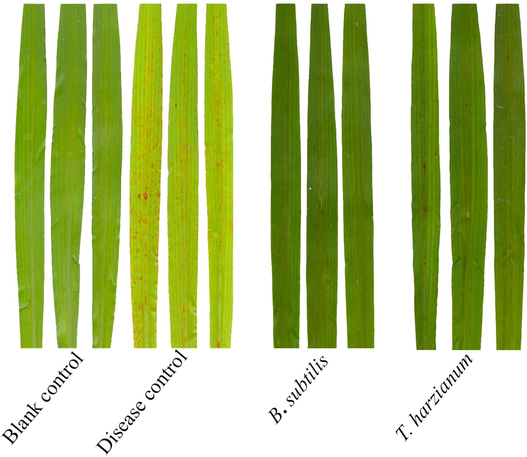 Four sets of plant leaves are shown to demonstrate different treatments. From left to right: “Blank control” leaves appear healthy. “Disease control” leaves show yellowing and red spots. “B. subtilis” and “T. harzianum” leaves look healthy, similar to the blank control.
