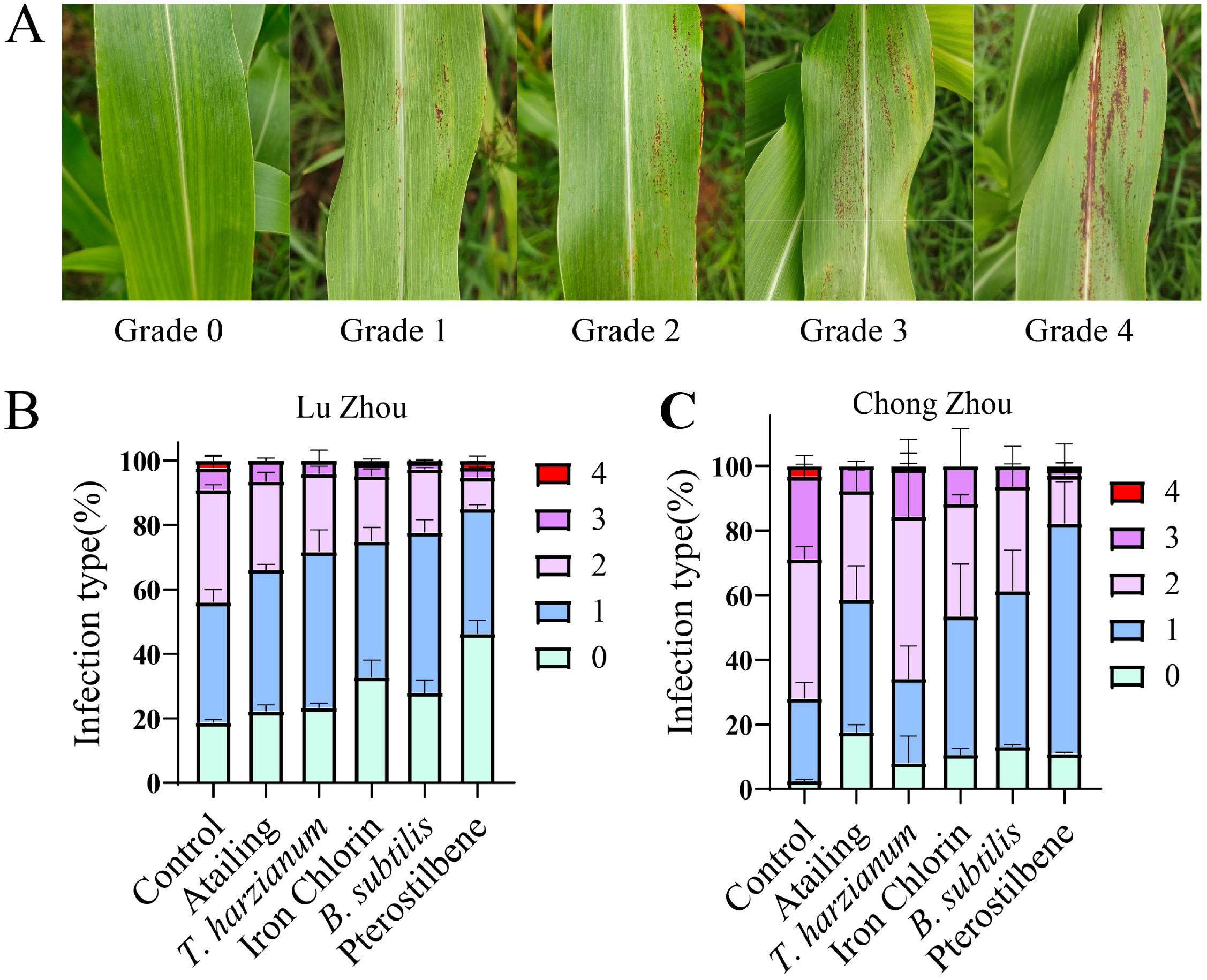 Panel A shows corn leaves with increasing severity of infection from Grade 0 to Grade 4, with visible discoloration and lesions. Panel B displays a bar chart for Lu Zhou, and Panel C for Chong Zhou, indicating infection type percentages across different treatments, with a color-coded legend representing infection grades from zero to four.