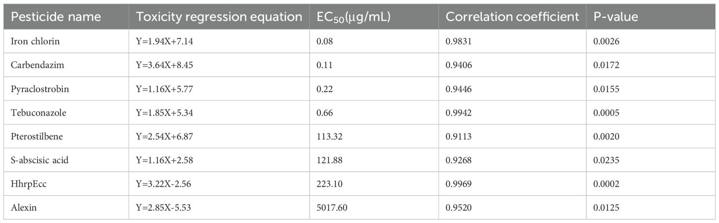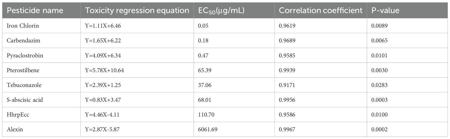 Virulence regression equations were constructed using the agent concentration as the x-axis and the probit-transformed inhibition rate as the y-axis. Regression parameters, correlation coefficients (r), and median effective concentrations (EC50;) with 95% confidence intervals were estimated using probit analysis in SPSS 26.0 software. EC50; values were used to compare inhibitory potencies and select agents with high efficacy at low doses.