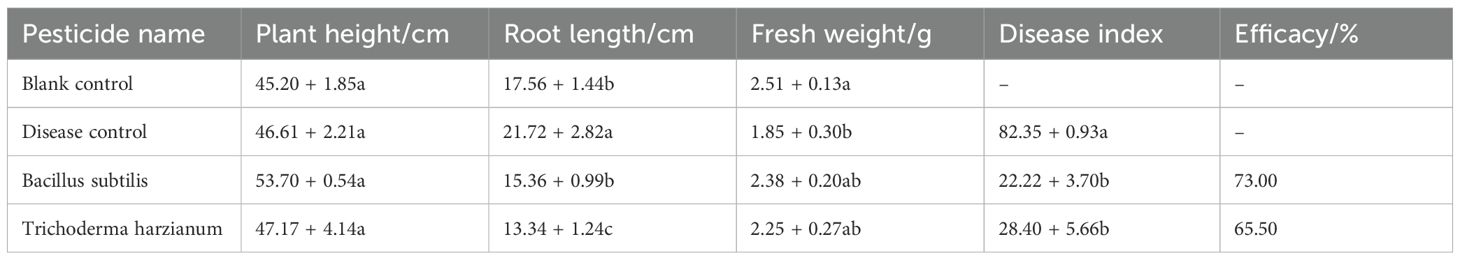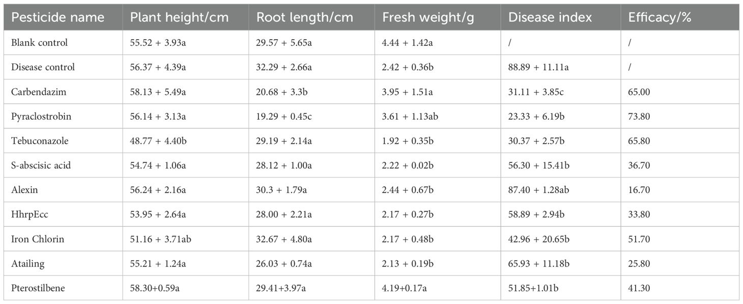All data were analyzed with SPSS 26.0 software (IBM Corp., Armonk, NY, USA). Means of plant growth parameters, inhibition rates, EC50; values, disease indices, and control efficacies were compared using one-way analysis of variance (ANOVA) followed by the least significant difference (LSD) test at P< 0.05.