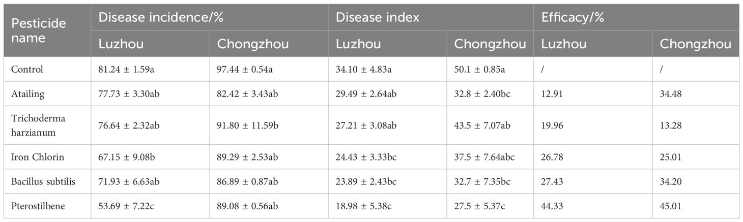 Table 3. Control efficacy of three chemical fungicides and six biofungicides against sorghum anthracnose.