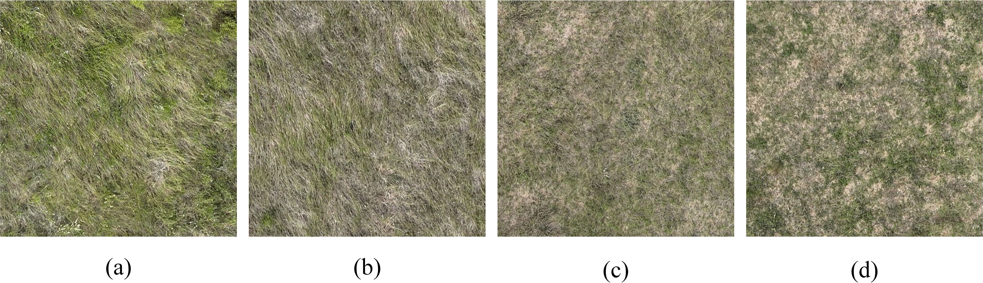 Figure 2. Visible-light UAV images illustrating different grazing intensities. (a) No grazing, (b) light grazing, (c) moderate grazing, and (d) severe grazing.