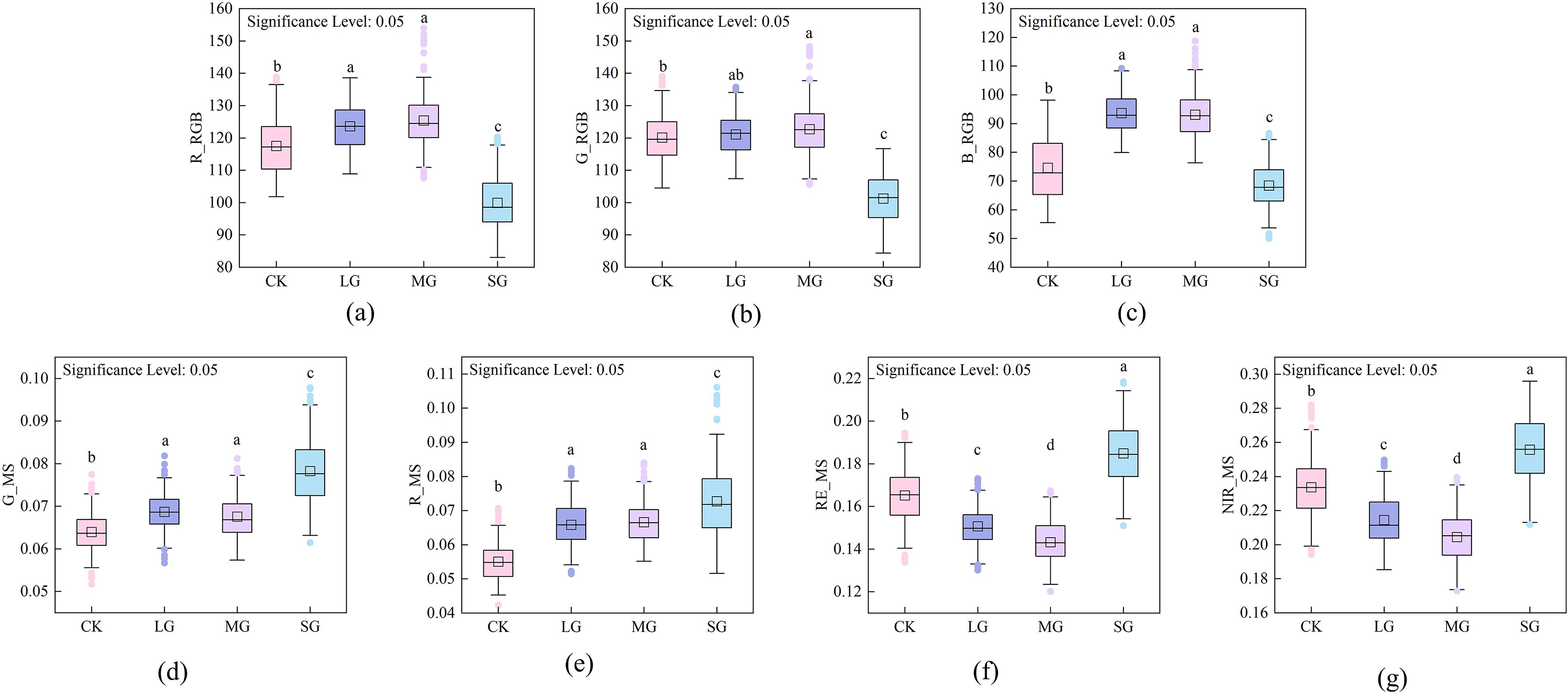 The spectral mean and variance curves under different grazing intensities are presented in Figure 4. The grey values of the three visible-light features generally increased with grazing intensity, but decreased under severe grazing. In the multispectral bands, green and red reflectance increased with grazing intensity, whereas the red-edge and near-infrared bands showed decreasing trends. However, under severe grazing, both the red-edge and near-infrared bands exhibited an increasing trend.