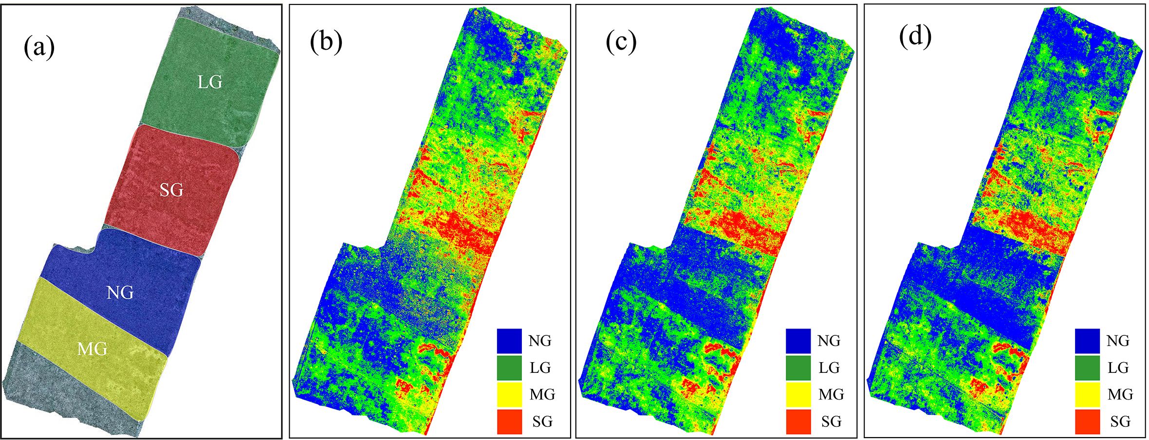 Figure 7. Pixel-level classification maps under different combinations of original features and classifiers. (a) Reference grazing intensity map; (b) RGB features with KNN, (c) multispectral (Multi) features with KNN, and (d) multi-source fusion (RGB+Multi) features with SVM. (e.g., NG, No Grazing; LG, Light Grazing; MG, Moderate Grazing; SG, Severe Grazing).