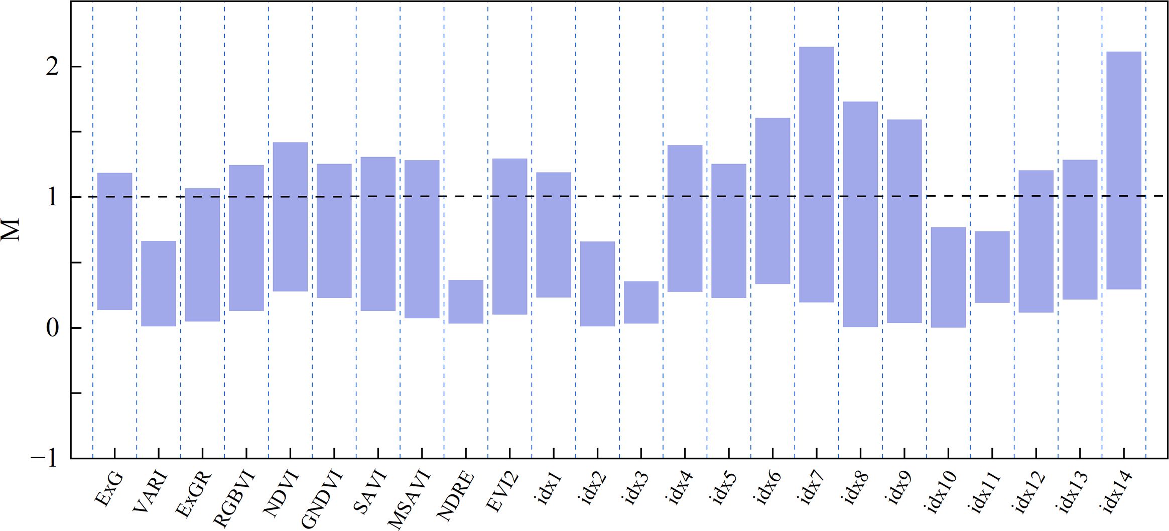 The M-statistic was applied to assess the separability of the SIs, with results presented in Figure 8. For most indices, M values exceeded 1, indicating good separability among grazing intensity levels. Traditional visible indices (ExG, ExGR, RGBVI) and red–NIR indices (NDVI, GNDVI, SAVI, MSAVI, EVI2) generally exhibited high separability. Their maximum M values all exceeded 1, while the mean values were mainly within the range of 0.6 to 1.0. In contrast, NDRE, idx3, and several other indices showed poor separability, with maximum M values below 0.4. Notably, among the self-constructed indices, idx6, idx7, and idx14 performed best, with maximum M values exceeding 1.5. In particular, idx7 and idx14 reached extreme values above 2, demonstrating substantial advantages in capturing vegetation responses to grazing intensity and outperforming traditional indices.