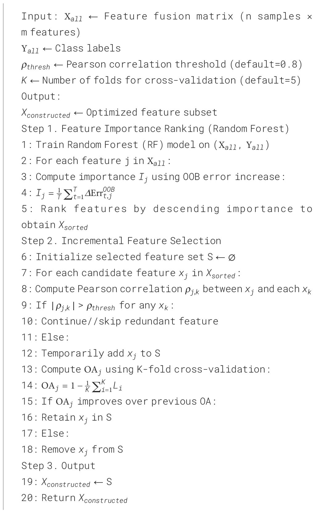 Algorithm 1 summarizes the AIFS procedure. The algorithm ranks features using RF importance, incrementally evaluates candidate features based on Pearson correlation and cross-validated accuracy, and retains only those that improve classification while minimizing redundancy.