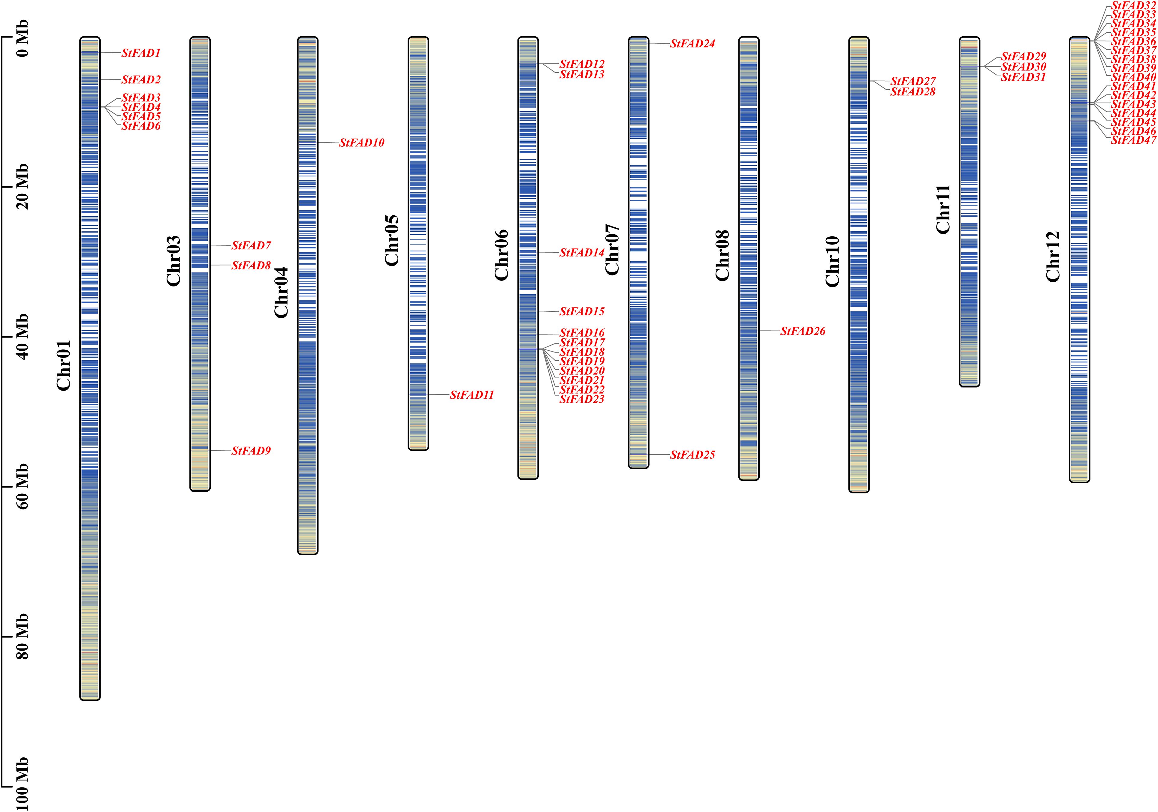 Figure 1. Chromosomal distribution of the StFAD genes in Solanum tuberosum. The physical locations of the 47 StFAD family members are mapped onto 12 chromosomes (Chr01–Chr12) based on the S. tuberosum genome assembly. Gene names are indicated in red and positioned according to their relative physical coordinates (Mb scale is shown on the left). The chromosome lengths are represented proportionally, with darker blue in the vertical bars along each chromosome indicating regions of greater gene density.