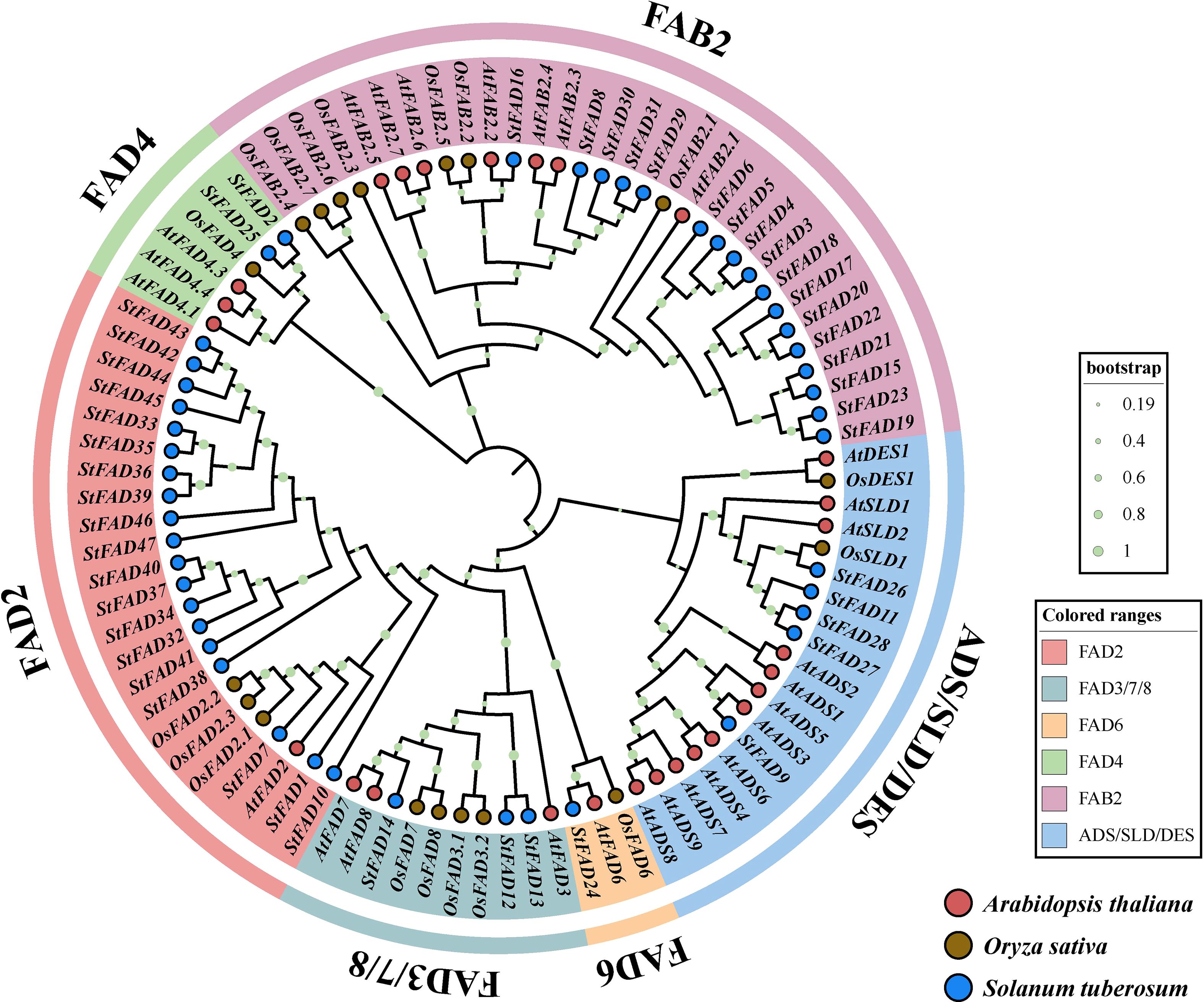 Figure 2. Phylogenetic analysis of FAD gene family members from Solanum tuberosum, Arabidopsis thaliana, and Oryza sativa. The maximum likelihood (ML) tree was constructed based on full-length amino acid sequences of FAD proteins from the three species, with branch supports indicated by bootstrap values (n = 1000; color-coded circles at nodes represent different bootstrap ranges as shown in the legend). S. tuberosum, A. thaliana, and O. sativa sequences are denoted by blue, red, and brown circles, respectively. The tree resolves FAD proteins into six distinct clades, FAD2, FAD3/7/8, FAD6, FAD4, FAB2, and ADS/SLD/DES, differentiated by background color.