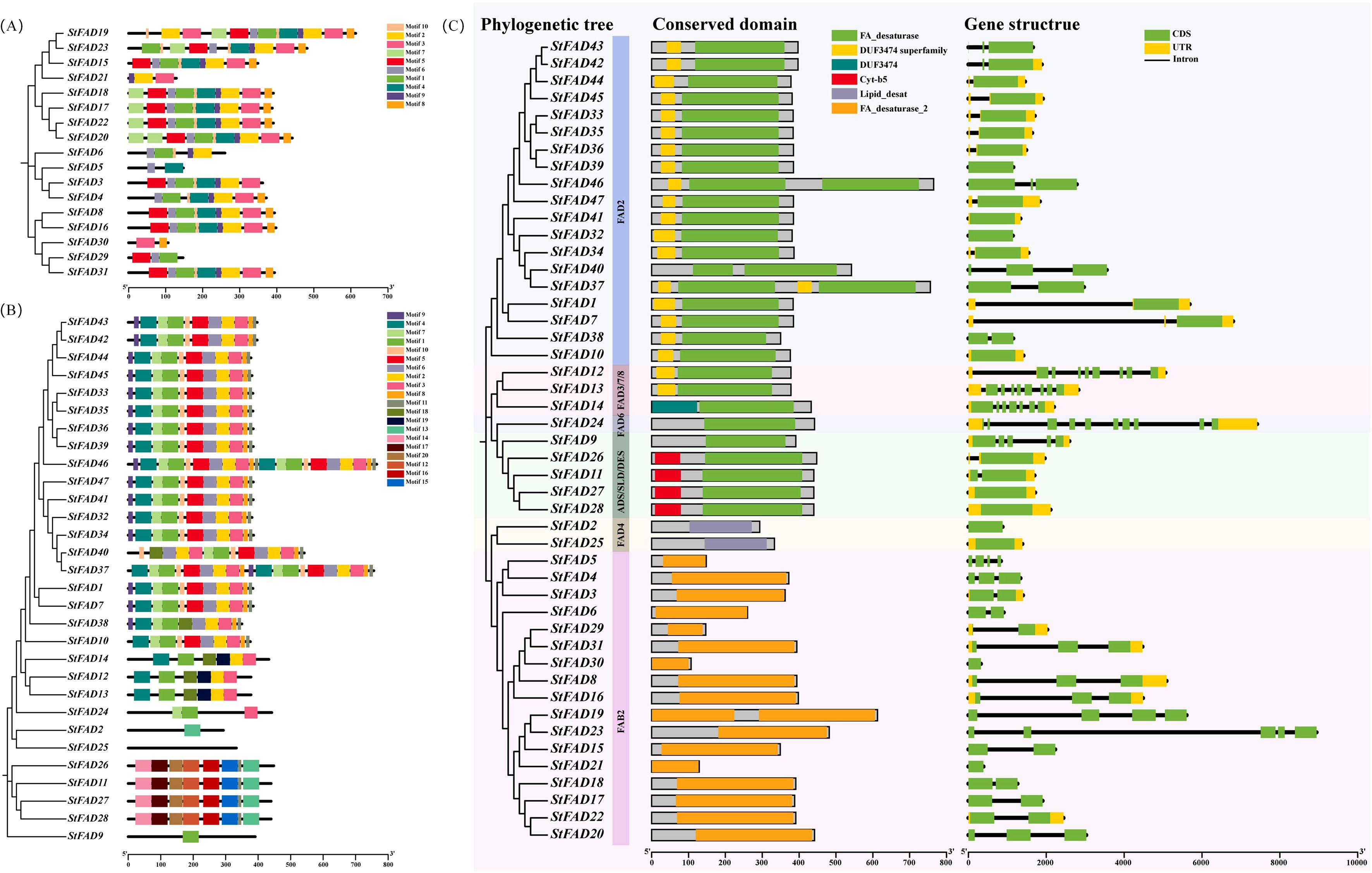 Figure 3. Phylogenetic relationships, conserved motif composition, domain organization, and gene structure of StFAD family members in Solanum tuberosum. (A, B) Distribution of conserved motifs among StFAD proteins as identified by MEME analysis. Each motif is represented by a distinct colored box, with its position corresponding to the relative location within the protein sequence. The phylogenetic trees on the left were constructed based on the full-length amino acid sequences, grouping StFAD members into different clades. (C) Integrated analysis of phylogenetic classification (left), conserved domain architecture (middle), and exon–intron structure (right) of StFAD genes. Conserved domains were annotated using Pfam and SMART, with color-coded boxes representing distinct domain types. Gene structure diagrams display coding sequences (CDS, green), untranslated regions (UTRs, yellow), and introns (black lines). Background shading denotes distinct subfamilies based on phylogenetic clustering.