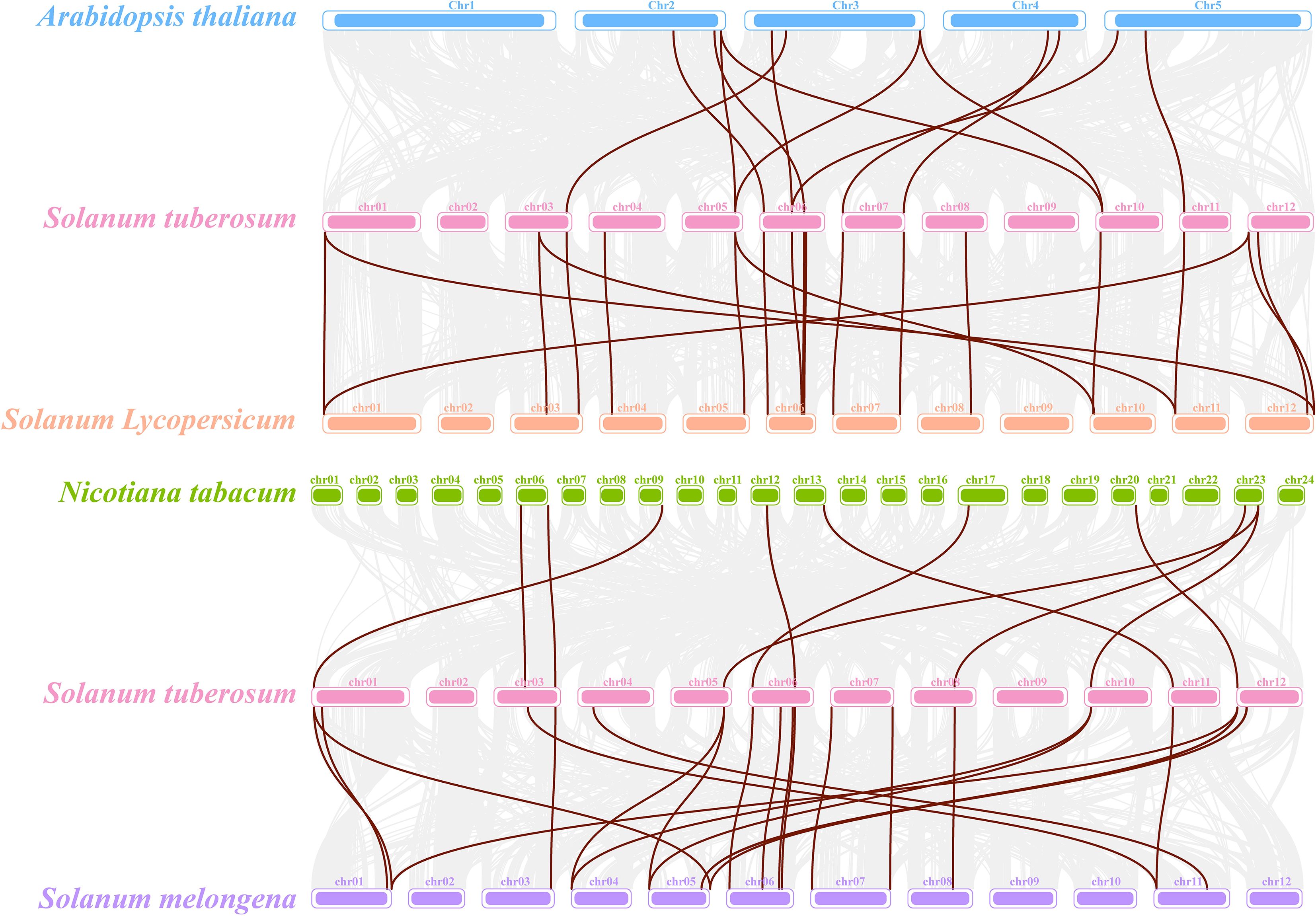 For interspecies synteny analysis, genome sequences and annotation files for A. thaliana were obtained from Phytozome v13 (https://phytozome-next.jgi.doe.gov/, accessed on 13 February 2025), those for tomato (S. lycopersicum) were obtained from NCBI (https://www.ncbi.nlm.nih.gov/, accessed on 13 February 2025), those for tobacco (N. tabacum) were derived from the Sol Genomics Network (https://solgenomics.net/, accessed on 15 February 2025), and those for eggplant (S. melongena) were obtained from the Eggplant Genome Database (http://www.eggplant-hq.cn/Eggplant/home/index, accessed on 16 February 2025). MCScanX was used to assess collinearity between S. tuberosum and each of these species.