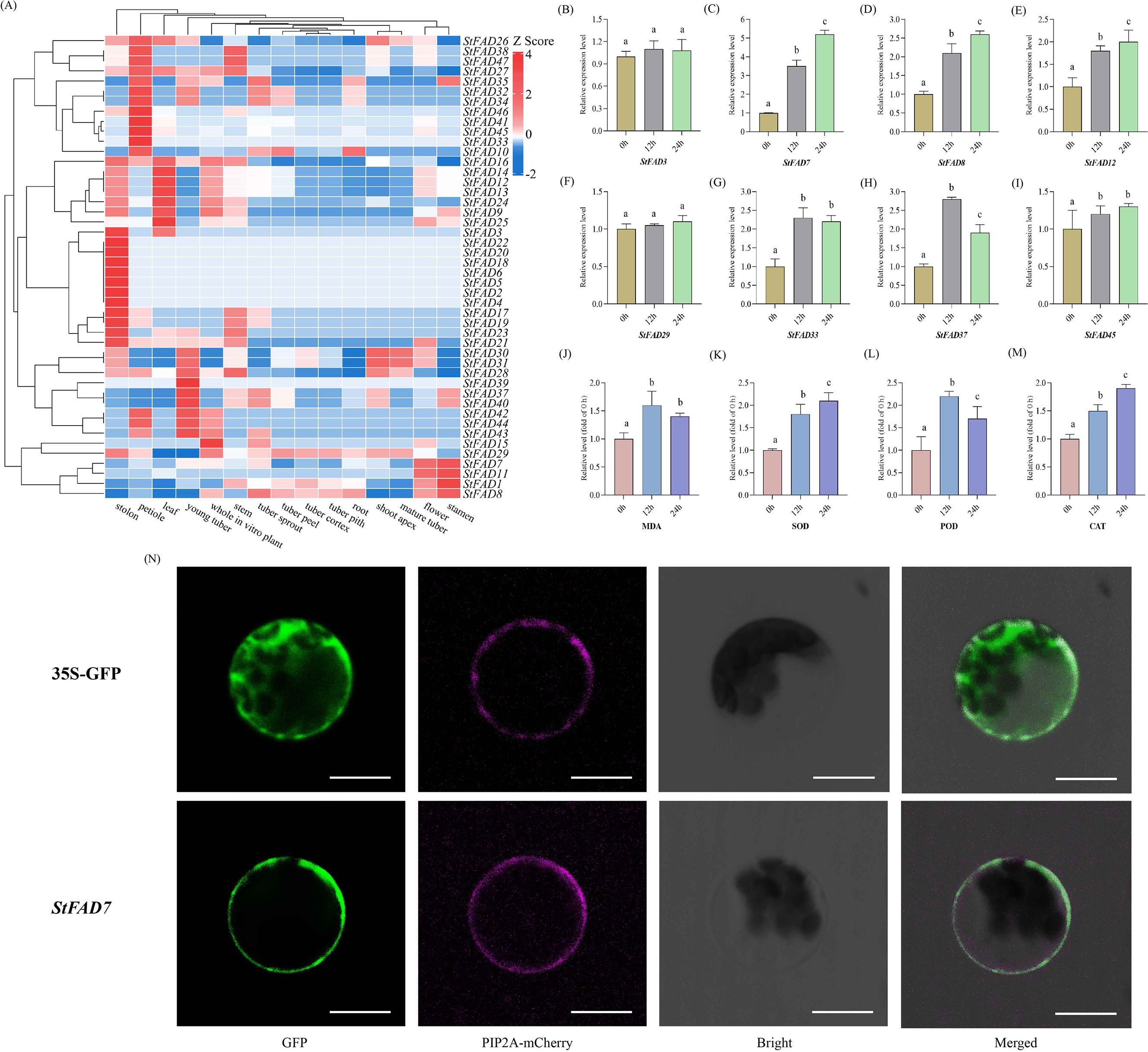 Figure 6. Expression profiles, physiological responses, and subcellular localization of StFAD genes under cold stress. (A) Heatmap showing the expression profiles of 47 StFAD genes across 15 tissues in Solanum tuberosum. Expression values were obtained from RNA-seq datasets and normalized using Z-score transformation for each gene. Red and blue represent relatively high and low transcript levels, respectively. (B–I) Relative expression levels of eight representative StFAD genes in potato tubers subjected to cold stress (4°C) for 0, 12, and 24 h. The X-axis represents Time after 4°C treatment (h), corresponding to 0 h (control), 12 h (early response), and 24 h (sustained/recovery phase). Gene expression was quantified by qRT-PCR and normalized to the expression level at 0 h (set as 1.00). Bars represent mean ± SD of three biological replicates. Different letters indicate significant differences between time points at p < 0.05 (Duncan’s multiple range test). (J–M) Changes in four physiological parameters, including MDA, SOD, POD, and CAT levels, measured in the same samples under 4°C treatment for 0, 12, and 24 h Values are expressed as relative fold of control (0 h = 1.00). Bars indicate mean ± SD (n = 3). Different letters denote statistically significant differences (p < 0.05) according to Duncan’s test. (N) Subcellular localization of StFAD7 in Nicotiana benthamiana epidermal cells. Confocal laser scanning microscopy images show GFP fluorescence (green), the plasma membrane marker PIP2A-mCherry (magenta), bright-field images, and merged channels. The control construct (35S::GFP) exhibited ubiquitous GFP fluorescence in the cytoplasm and nucleus, whereas StFAD7-GFP fusion protein fluorescence was predominantly detected at the cell periphery, co-localizing with PIP2A-mCherry. Scale bars = 20 μm.