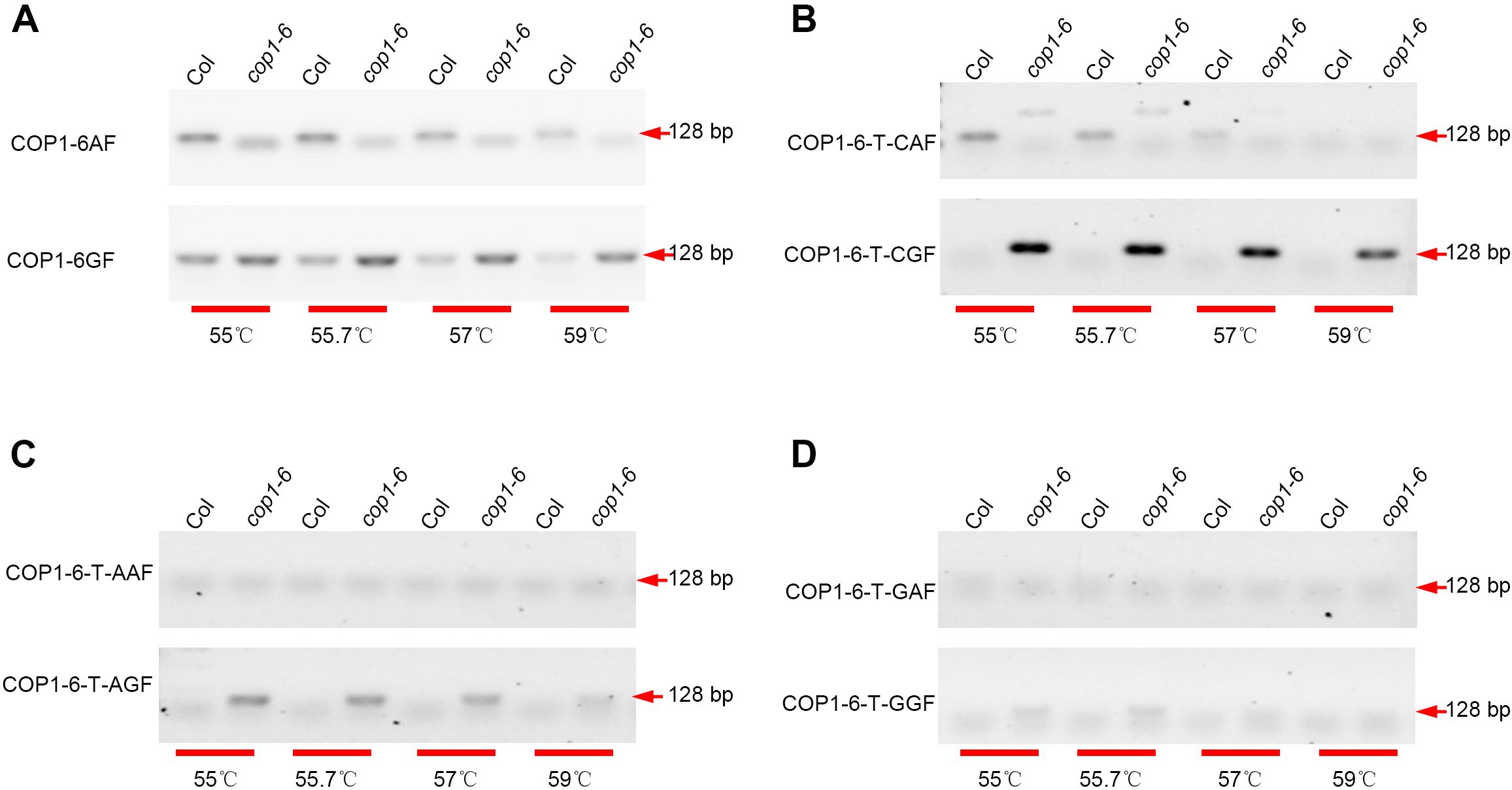 Figure 1. Detection the point mutation between Col and cop1-6. Using the DNA of Col and cop1–6 as template respectively, PCR reactions were performed using the following primer pairs: COP1-6AF/COP1-6SR (upper) and COP1-6GF/COP1-6SR (lower) (A), COP1-6-T-CAF/COP1-6SR (upper) and COP1-6-T-CGF/COP1-6SR (lower) (B), COP1-6-T-AAF/COP1-6SR (upper) and COP1-6-T-AGF/COP1-6SR (lower) (C), COP1-6-T-GAF/COP1-6SR (upper) and COP1-6-T-GGF/COP1-6SR (lower) (D). These reactions were carried out at varying annealing temperatures (55 °C, 55.7 °C, 57 °C, and 59 °C). Subsequently, the PCR products were analyzed via agarose gel electrophoresis.