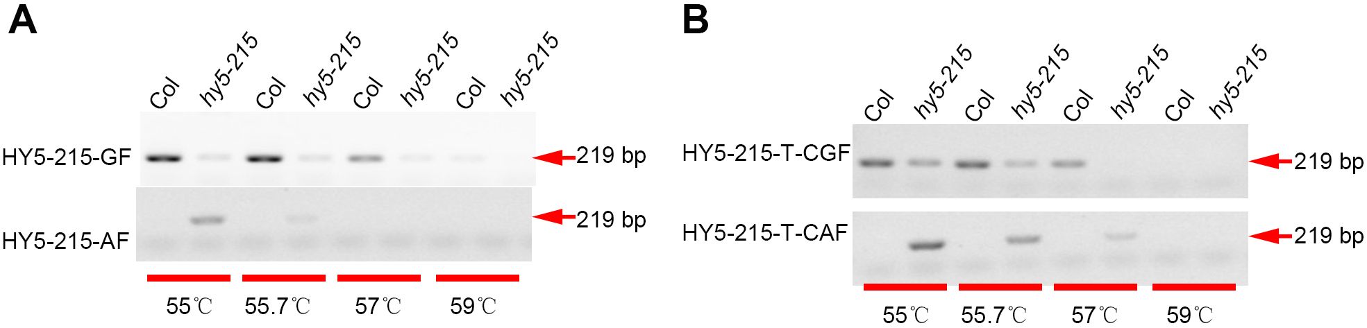 Figure 2. Detection the point mutation between Col and hy5-215. PCR reactions were conducted using DNA templates from Col and hy5-215, with the following primer pairs employed: HY5-215-GF/HY5-215-R (upper) and HY5-215-AF/HY5-215-R (lower) (A), HY5-215-T-CGF/HY5-215-R (upper) and HY5-215-T-CAF/HY5-215-R (lower) (B). These reactions were carried out at varying annealing temperatures (55 °C, 55.7 °C, 57 °C, and 59 °C). Subsequently, the PCR products were analyzed via agarose gel electrophoresis.