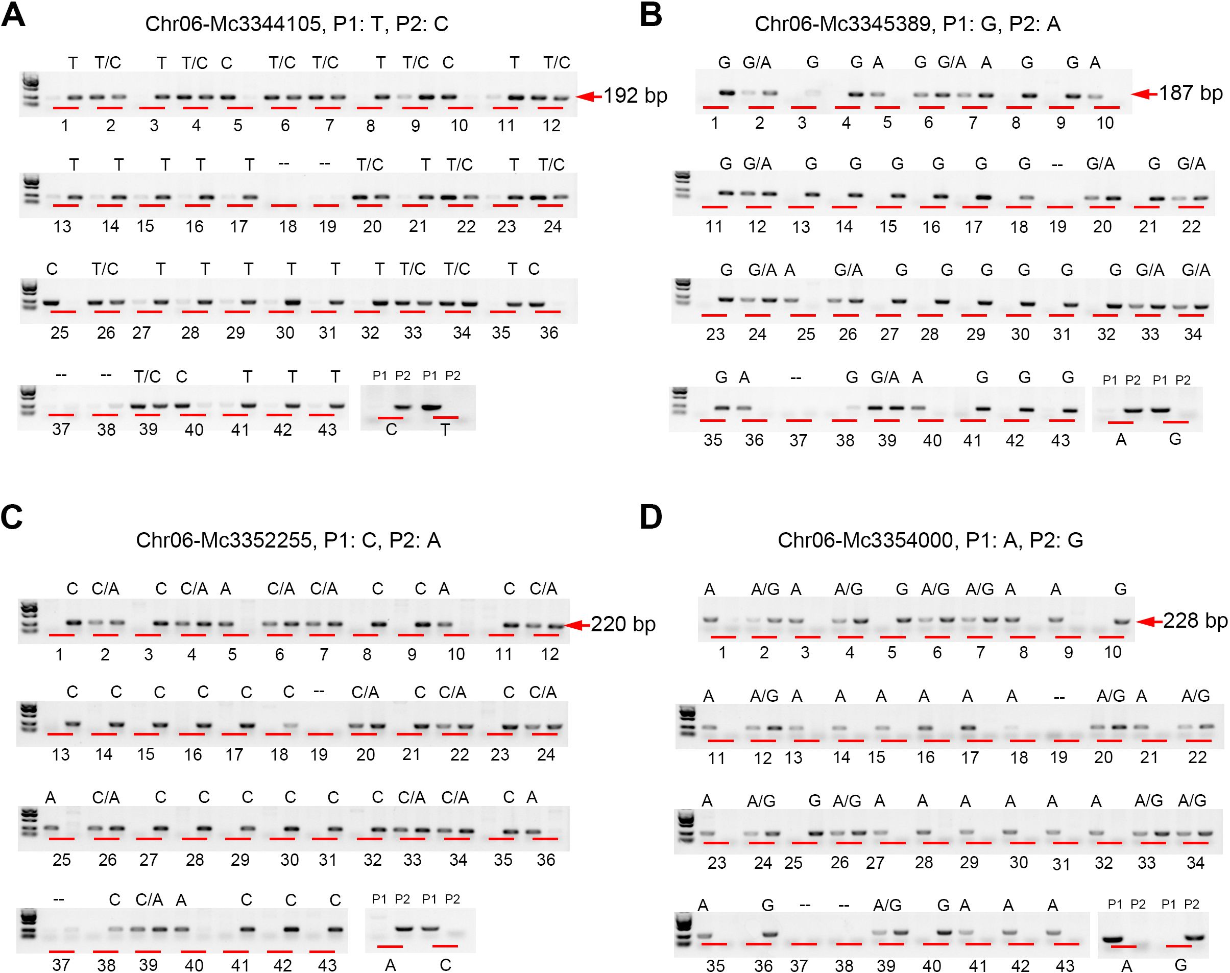 Figure 3. The (‘T-C’) mismatched method was utilized to design SNP markers for detecting the F2 generations of bitter gourd. A 1-bp mismatch (‘T-C’) was introduced into the forward primers to detect SNPs at positions Chr06 3,344,105 (A), 3,345,389 (B), 3,352,255 (C), and 3,354,000 (D) in bitter gourd. Here, P1 and P2 denote the parental lines, while “–” indicates the absence of PCR products. These reactions were carried out at an annealing temperature of 55 °C. Subsequently, the PCR products were analyzed via agarose gel electrophoresis.
