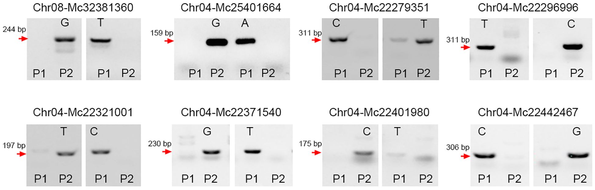 Figure 4. Using the (‘T-C’) mismatched method to design SNP markers in bitter gourd. Eight SNP markers, including Chr08-Mc32381360 (G/T), Chr04-Mc25401664 (G/A), Chr04-Mc22279351 (C/T), Chr04-Mc22296996 (T/C), Chr04-Mc22321001 (T/C), Chr04-Mc22371540 (G/T), Chr04-Mc22401980 (C/T), and Chr04-Mc22442467 (C/G), were developed. P1 and P2 represent two parental lines. These reactions were carried out at an annealing temperature of 55 °C. Subsequently, the PCR products were analyzed via agarose gel electrophoresis.
