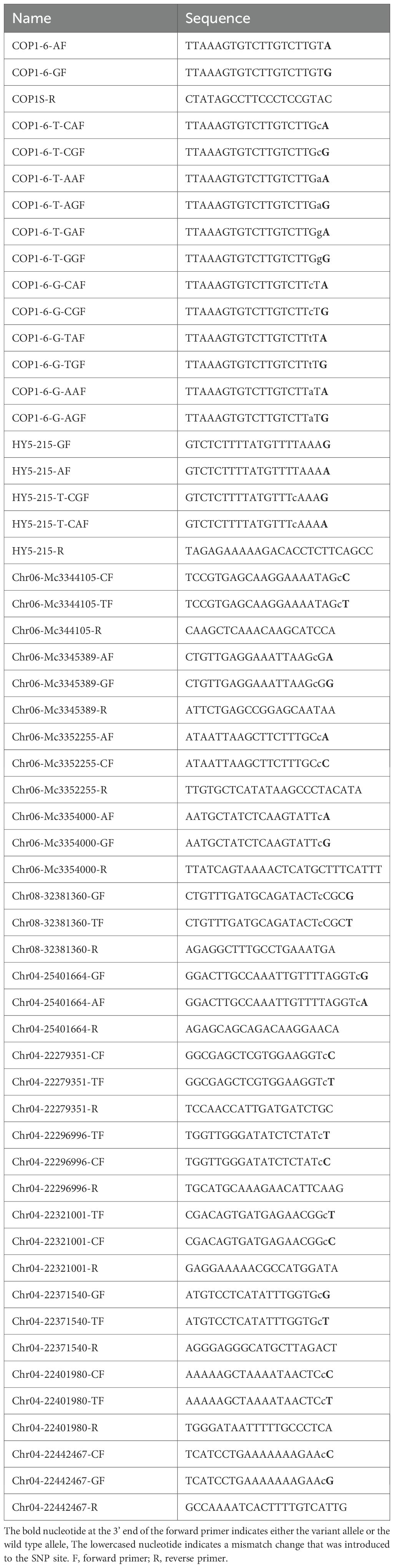 Constitutive Photomorphogenic 1 (COP1) and Elongated Hypocotyl 5 (HY5) are master regulatory hub in plants, central not just to light signaling but also to integrating a wide array of stress responses (Chattopadhyay et al., 1998; Lau and Deng, 2012; Han et al., 2020, Xiao et al., 2021, Mankotia et al., 2024). To facilitate the identification of the mutants cop1–6 and hy5-215, we developed a simplified method as an alternative to Sanger sequencing. In this study we found the substitution of the base T with C within a 5 bp region upstream of the SNP significantly enhances primer specificity. In brief, we constructed a simple and low throughput SNP detection system via adding artificial mismatch bases to the forward primer, and this approach is a flexible, rapid, sensitive, and inexpensive way for low throughput SNP scoring.