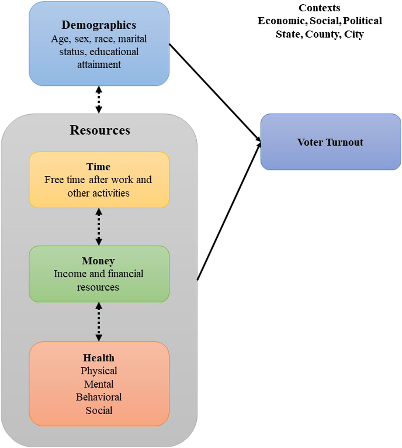 In our model, an individual’s likelihood of turning out to vote is a function of their available resources, which may be grouped into several broad categories. These categories are similar to the Brady resource model, but modified for this study to incorporate health. As previously stated, the resource model of political participation includes three key resources–time, money, and civic skills (Brady et al., 1995). In our adapted model for this study, the key resources included are time, money, and health. Similar to Brady, time in our model represents the free time an individual has available after normal work and other activities. Money refers to the financial or monetary resources available to an individual. In Brady’s model, civic skills is the third resource and refers to the communication and organizational skills necessary to be politically active (Brady et al., 1995). In this study, we do not have similar measures of civic skills but some assessment of civic skills may be captured through educational attainment, which is included in this study (Brady et al., 1995). In addition to the resources outlined by Brady, our model explicitly incorporates health as an additional resource, given the emerging relationship between health and participation outlined in previous research (Brown et al., 2020).