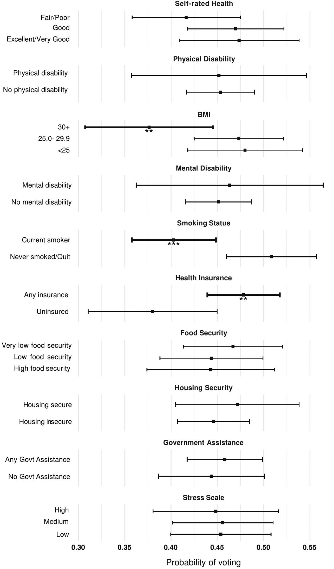 Results: In both cities, less than 50 percent of respondents reported voting in the last election for mayor or city council. About three-quarters of the sample reported food or housing insecurity and the majority of respondents reported utilizing some government assistance, such as supplemental nutrition programs. BMI greater than 30 was significantly associated with lower likelihood of voter turnout compared to those of lower BMI status (marginal effect = −0.10, p = 0.026). Never smoking or quitting was significantly associated with higher likelihood of voter turnout compared to those who reported being a current smoker (marginal effect = 0.10, p = 0.002). Those with health insurance were significantly more likely to report voting compared to those without any insurance (marginal effect = 0.10, p = 0.022). These results did not significantly differ by city.
