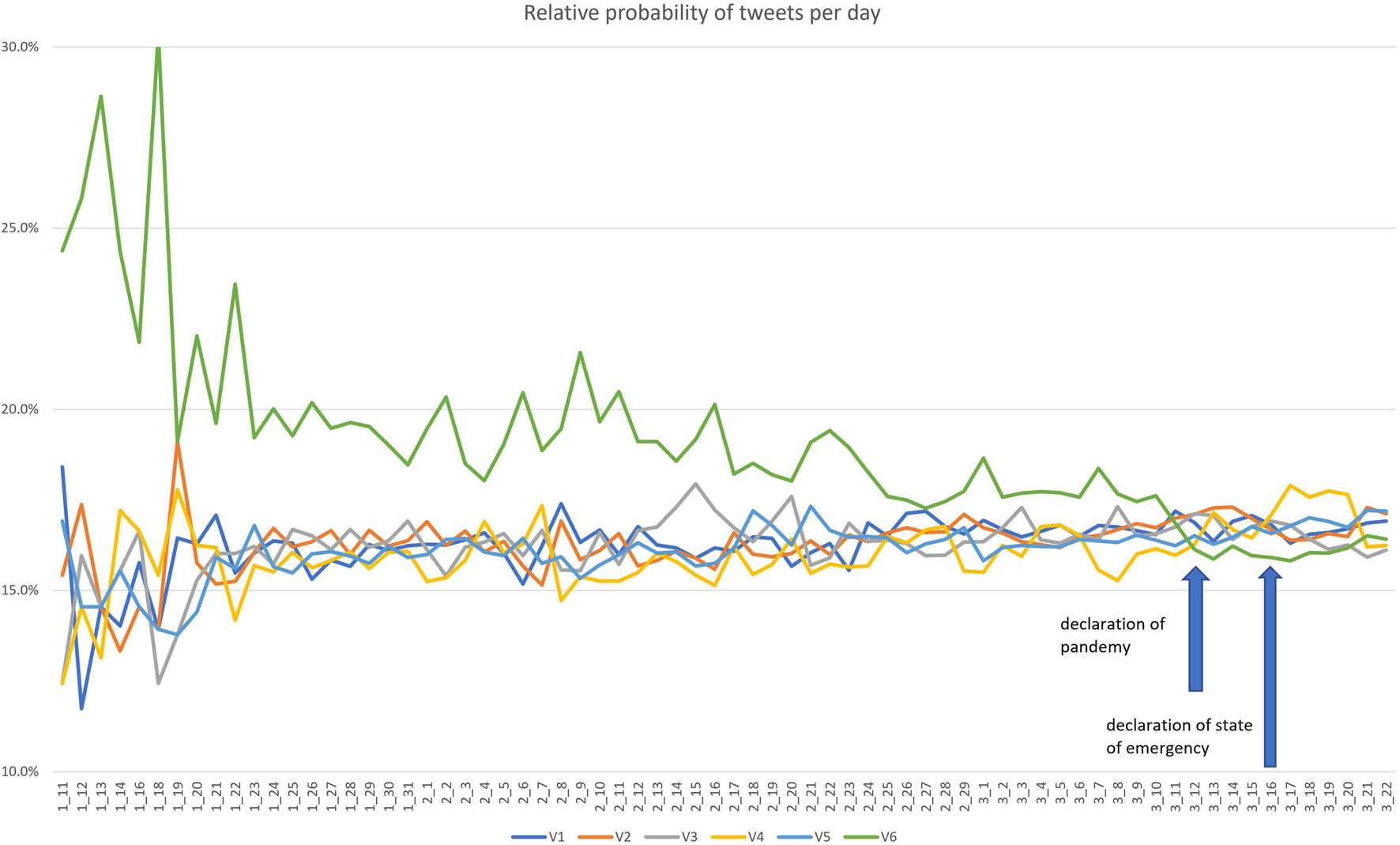 The first period’s overview of the topics: the average relative probability of tweets per day in the 6-day model. Note, there were only one to two tweets per day before 20 January 2020.