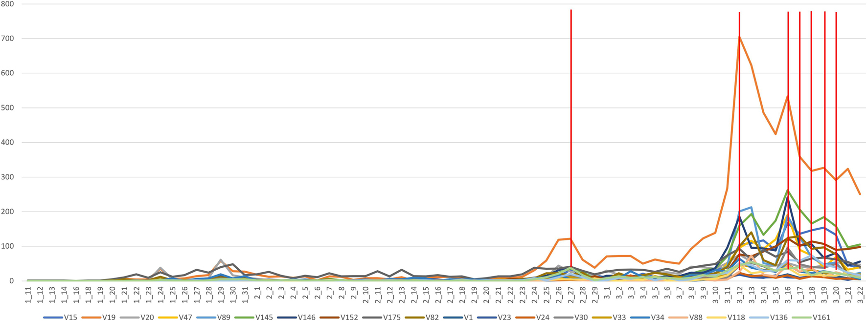 To reflect on the discursive transformation within a topic that gathers similar types of tweets, we chose the topic on closures (G3: T47), where the emergence of the phenomenon was discussed in China first, then in Italy, and finally, in Finland (Figure 3). It couples with our earlier analysis of how it was felt increasingly as a European and potentially Finnish issue and then as a Finnish issue. As with the six-topic model, the trend emerging on 24 February is that the international topic was overtaken by domestic issues this week with the declaration of the pandemic.