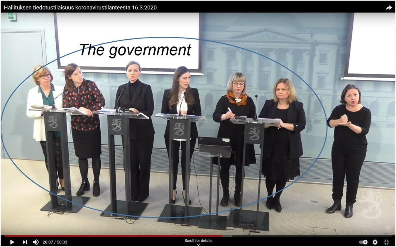 From 27 February to 20 March, period one, the conferences were all-female panels, and the PM started each of the press conferences followed by responsible ministers. Figure 5 shows what a female-led government looked like on 20 March and how Lintilä, as Minister responsible, presented on his own. Compared with the first photos on 16 March, when the phenomenon was hitting Finland and responsible ministers crammed into the view (Figure 5), by the formal address on 20 March, safety distances were in use. The topic was indeed survival of the industry and the additional budgets, demonstrating being in control of the livelihoods of the citizens in several categories. The next period would witness firmer actions, with the government taking measures to control the epidemiological situation.