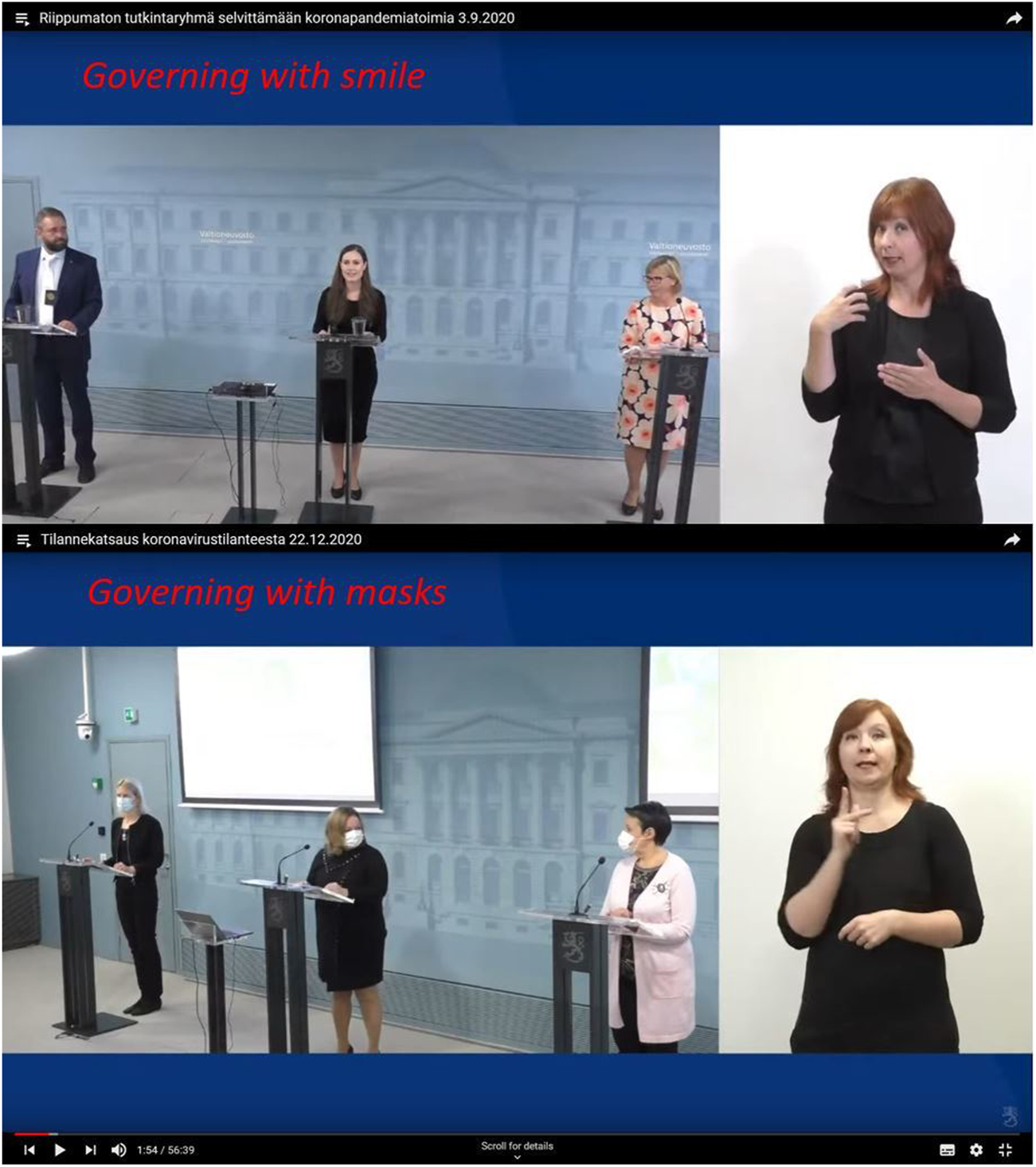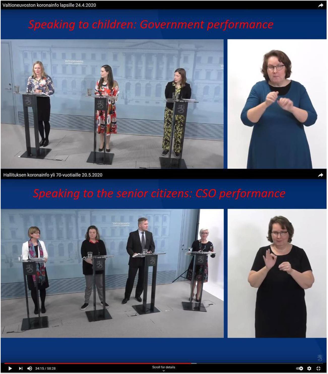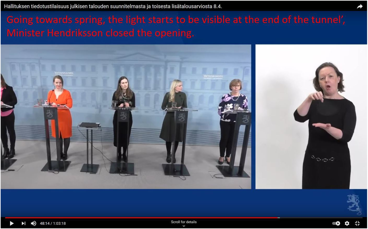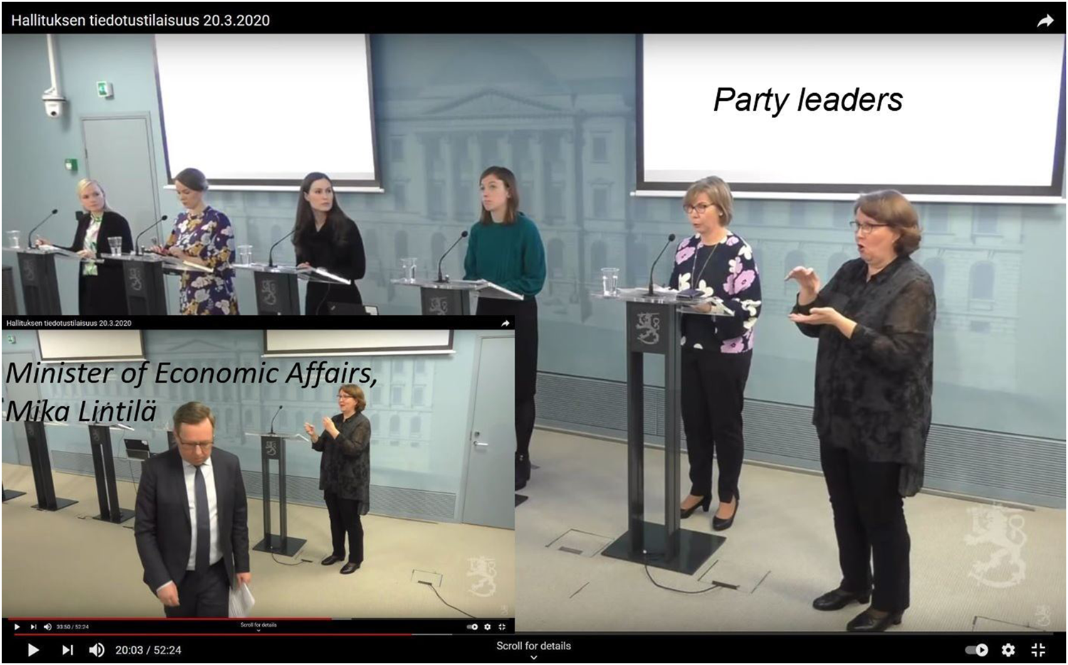 Juxtaposition: After party leaders, Maria Ohisalo (Green League), Katri Kulmuni (Centre), Sanna Marin (SDP), Li Andersson (Left Alliance), and Anna-Maja Hendriksson (Swedish People’s Party) stressed the case, Minister Mika Lintilä (Centre) went to substance. The sign language interpreters are in the picture (modified video screenshot).