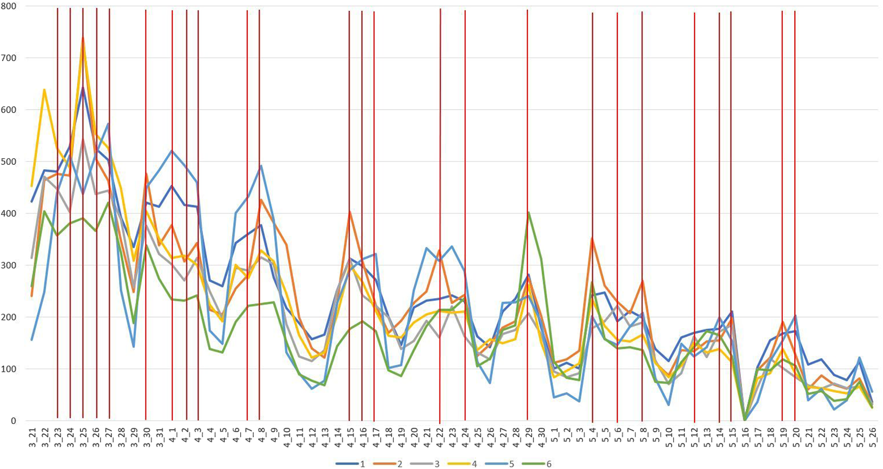We divided the topics into five loose groups according to the themes of the topics, which are listed matching topic peaks with press conferences (seeTable 3). The topic T26/G6 is considered here a technical topic and not included in our analysis (see Annex 9 for details). As seen in Figure 7, the general trend is that the discussions related to COVID-19 decreased during the second period. In late March, the most prominent topics had over 300 tweets per day, but during April, only one topic amounted to more than 200 tweets per day, except for 29 April. After 4 May, when the government declared it was re-opening society, the discussion frequency decreased. Considering the co-occurrence of the press conferences, and particularly G2 and G3 topics, we would argue that the press conferences were a significant part of the discussions of the pandemic in Finland in the hashtag landscapes.