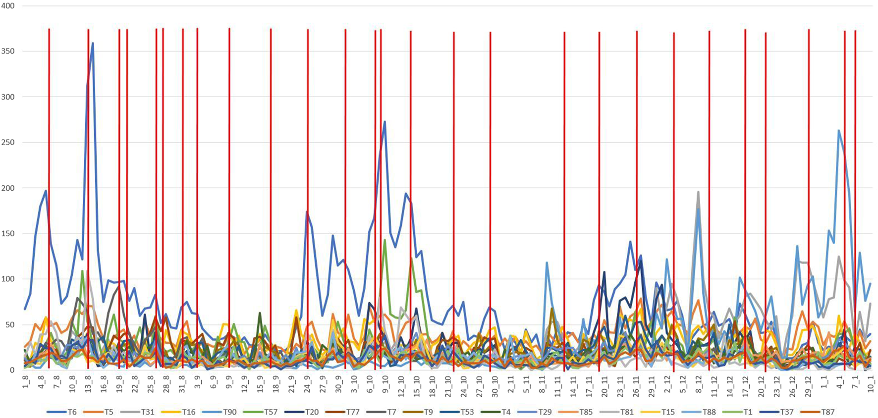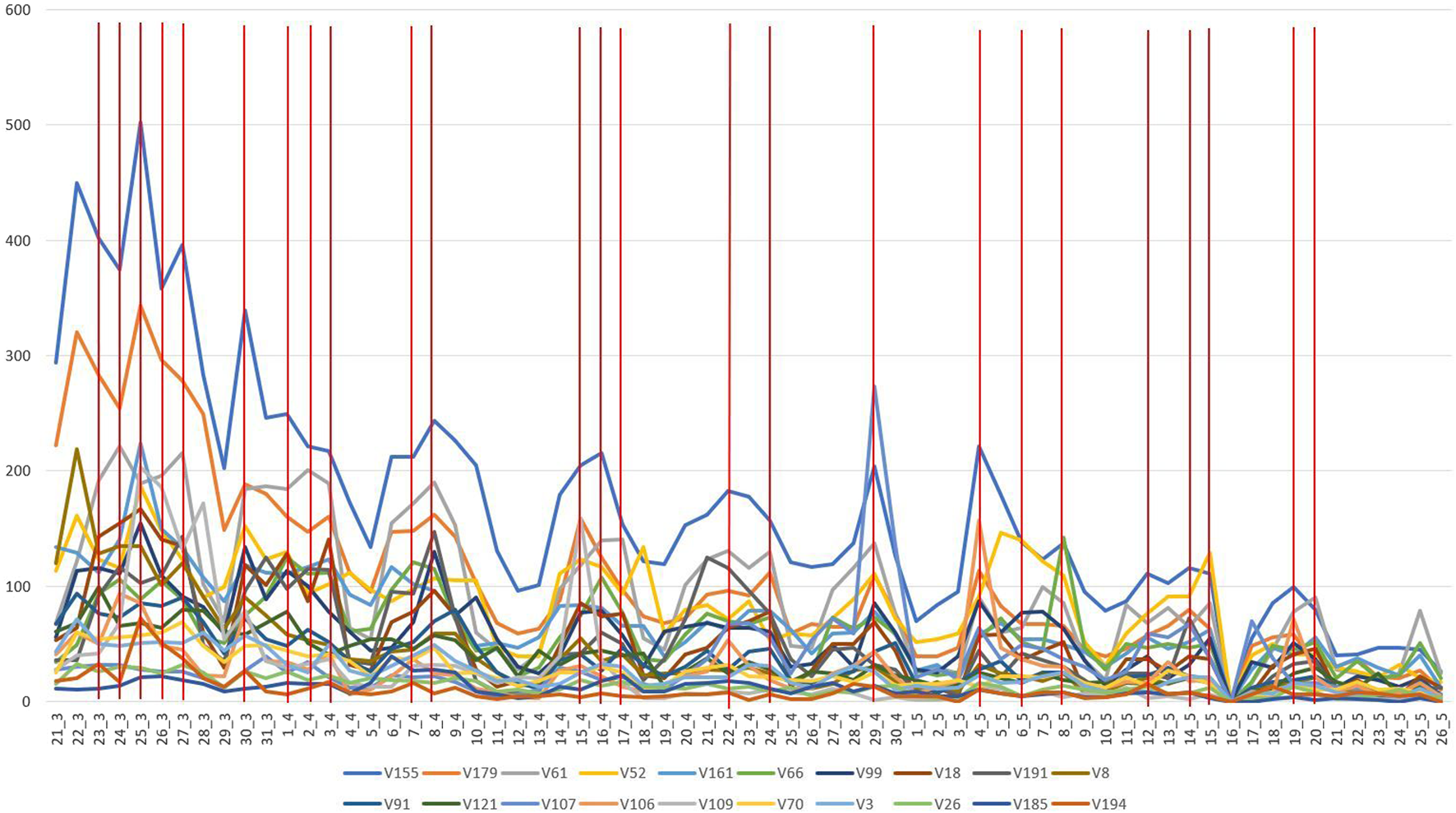 We observed a transformation between the strengths of the different topics, and, as Figure 3 demonstrates, how and when the pandemic and the Finnish state of emergency were declared; other topics overtook the relative importance of the international spreading of the virus (T6). To explore in more depth through multiple topics and matching the dates of the governmental press conferences on COVID-19, we worked on a larger list of topics (175 for the same period, Figure 2).