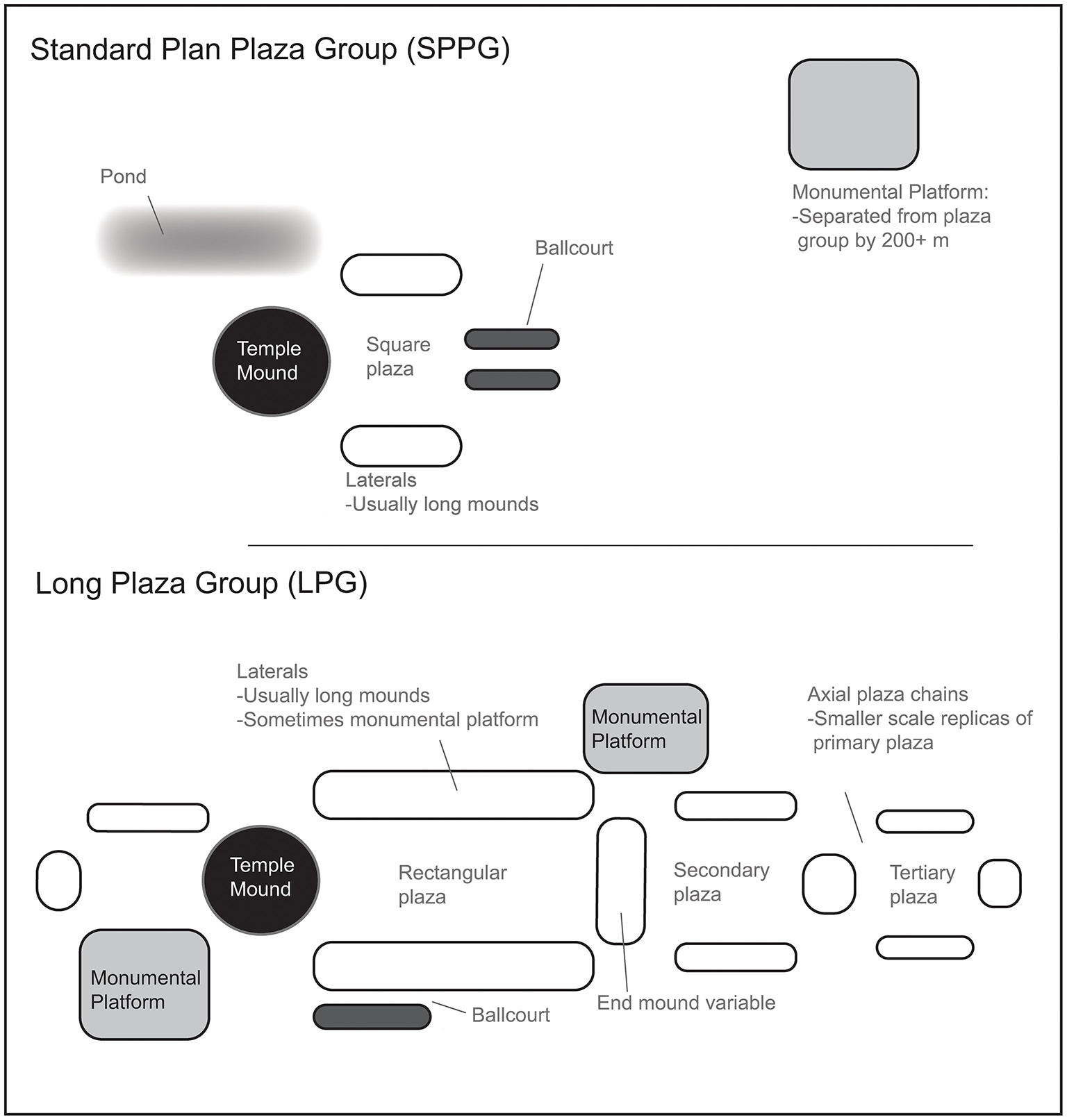 At lower levels in the SPPG settlement hierarchy, 3rd and 4th ranked centers typically lack either ball courts or monumental platforms. They also tend to deviate from the rigid adherence to the SPPG layout principles. The long mounds that may represent key groups are still present along with temple mounds, but the lower-order settlements have little evidence of local authoritarian leaders because of the lack of carvings and monumental platforms in all but a few cases, and they likely operated on a more collective community basis.