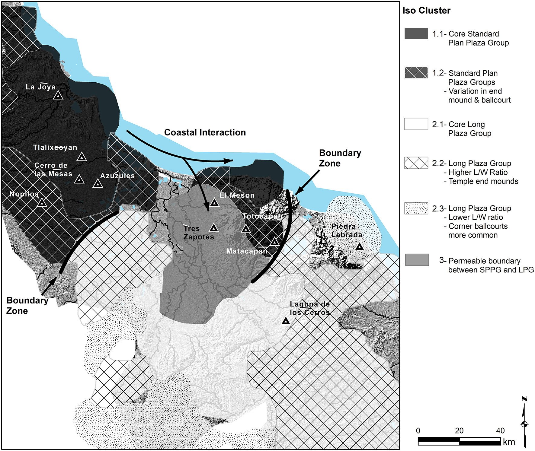 Pedestrian surveys have generated comprehensive information on settlement patterns, from the largest monumental architecture to common residences (e.g., Santley and Arnold, 1996; Borstein, 2001, 2005; Killion and Urcid, 2001; Symonds, 2002; Symonds et al., 2002; Urcid and Killion, 2008; Stoner, 2011; Loughlin, 2012; Budar, 2016; Daneels, 2016; Stark, 2021). In areas not surveyed on the ground, satellite and lidar (light detection and ranging) remote sensing provide preliminary data on the distribution and configuration of monumental architecture (Stoner, 2017; Inomata et al., 2021; Stoner et al., 2021; Stoner and Stark, 2022). Remote sensing relied mostly on five-m horizontal resolution lidar scans flown across the entire southern half of Veracruz, publicly available from the Instituto Nacional de Geografía y Estadística in Mexico. In some instances, multispectral satellite images (WorldView 2 and 3) assisted in the recognition of architectural configurations, such as the presence of ballcourts. A data base was compiled that coded variables concerning structures and spaces of monumental plaza groups (Stoner and Stark, 2022). The database also drew on archaeological surveys covering about 5,000 km2 of the 53,000 km2 covered by remote sensing.