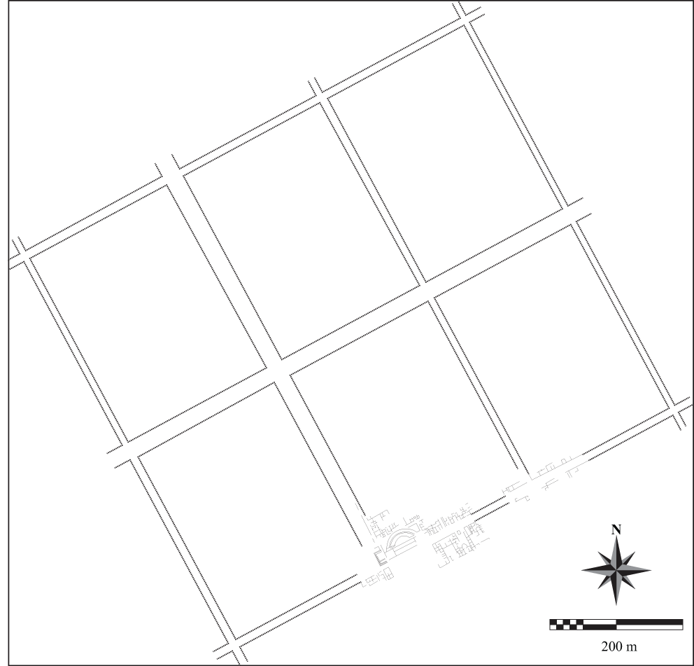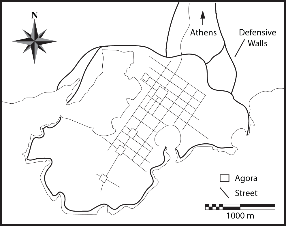 Our best evidence for democratic landscapes comes from town planning attributed to Hippodamus (Castagnoli, 1971). In the limited writings of Hippodamus that have come down to present, we know that he consciously linked town planning with political strategies and that he considered establishing order and standardization in town planning as key aspect of democratic processes (see Paden, 2001; Fleming, 2002; Mazza, 2009). Formally, Hippodamus divided urban space into public, private, and sacred and considered respect for these divisions key to establishing the social order necessary for democracy to flourish (Mazza, 2009). He also, in practice, apparently merged agorai and gridded street plans into the settlements that he planned (Paden, 2001, p. 43). Thus, agorai and orthogonal road systems became the recognized materialization of democracy in urban landscapes (Paden, 2001; Fleming, 2002; Mazza, 2009). The best examples of this style of town planning are visible in the construction of the Athenian port at Piraeus (we note that the palimpsest of Hippodamus' plan is still visible today in the modern city) and the colony of Thurii (known from archaeological excavations), which was promoted by Perikles as the ideal example of democratic order (Figures 1, 2) (Dicks, 1968; Paden, 2001; Fleming, 2002). Either consciously or unconsciously, the combination of agorai and orthogonal streets projected an ideological abstraction of order, freedom, and equality, because these planned towns ordered private, public, and sacred space, provided equal access to free spaces, and cut up residential spaces into highly standardized and uniform house lots that limited the degree to which any wealthy individuals could signal their importance through monumental residential architecture (Paden, 2001; Whitley, 2001, p. 359; Mazza, 2009). In both cases, we see the construction of multiple open spaces, linked with sacred precepts through temple construction where major streets crossed. This pattern is clearly visible in Piraeus with a line of agorai running along the central avenue, which formed the terminus of the highway that linked the port with Athens (Dicks, 1968: Figure 2). Temples and/or public buildings were constructed in several of these squares, as well as theaters at other important intersections (Figure 1). Thus, the Hippodamian city became a materialization of many aspects of Athenian democratic philosophy relating to equality.