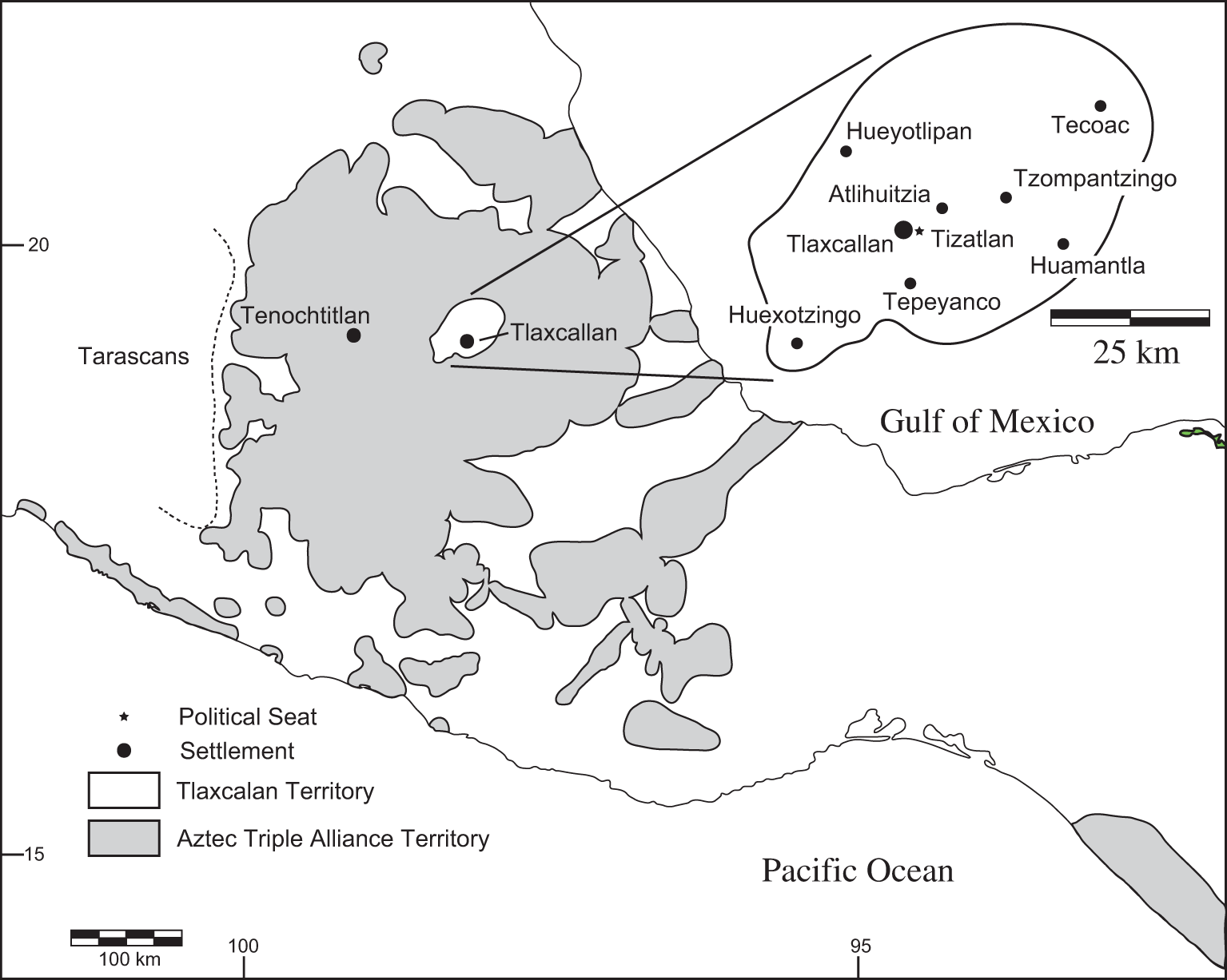 The pre-Hispanic, indigenous state of Tlaxcallan (C.E. 1300–1521), located in central Mexico about 100 km east of the Basin of Mexico (the large interior drainage basin that surrounds modern Mexico City), we argue, provides analogs to the political participation, isonomia, isegoria, and built environment we described for Athenian democracy. Tlaxcallan was a small, independent state, comparable in scale to Classical Attica, that was founded around 1300/1400 based on radiocarbon dating and ceramic cross ties. Previously, we argued that Tlaxcallan emerged in response to imperial threats emanating from Aztec polities centered in the Basin of Mexico (Fargher et al., 2010). While city-states in the vicinity of Tlaxcallan fell under the expanding domination of the Aztec Triple Alliance (known colloquially as the Aztec Empire), especially after 1428, Tlaxcaltecan political architects instituted or strengthened collective political strategies, building a multiethnic confederation of settlements spread over ~2,500 km2, with a population of ~250,000 to 300,000. This confederation was able to withstand onslaught after onslaught by the Aztec and remained independent (Fargher et al., 2010, 2011).