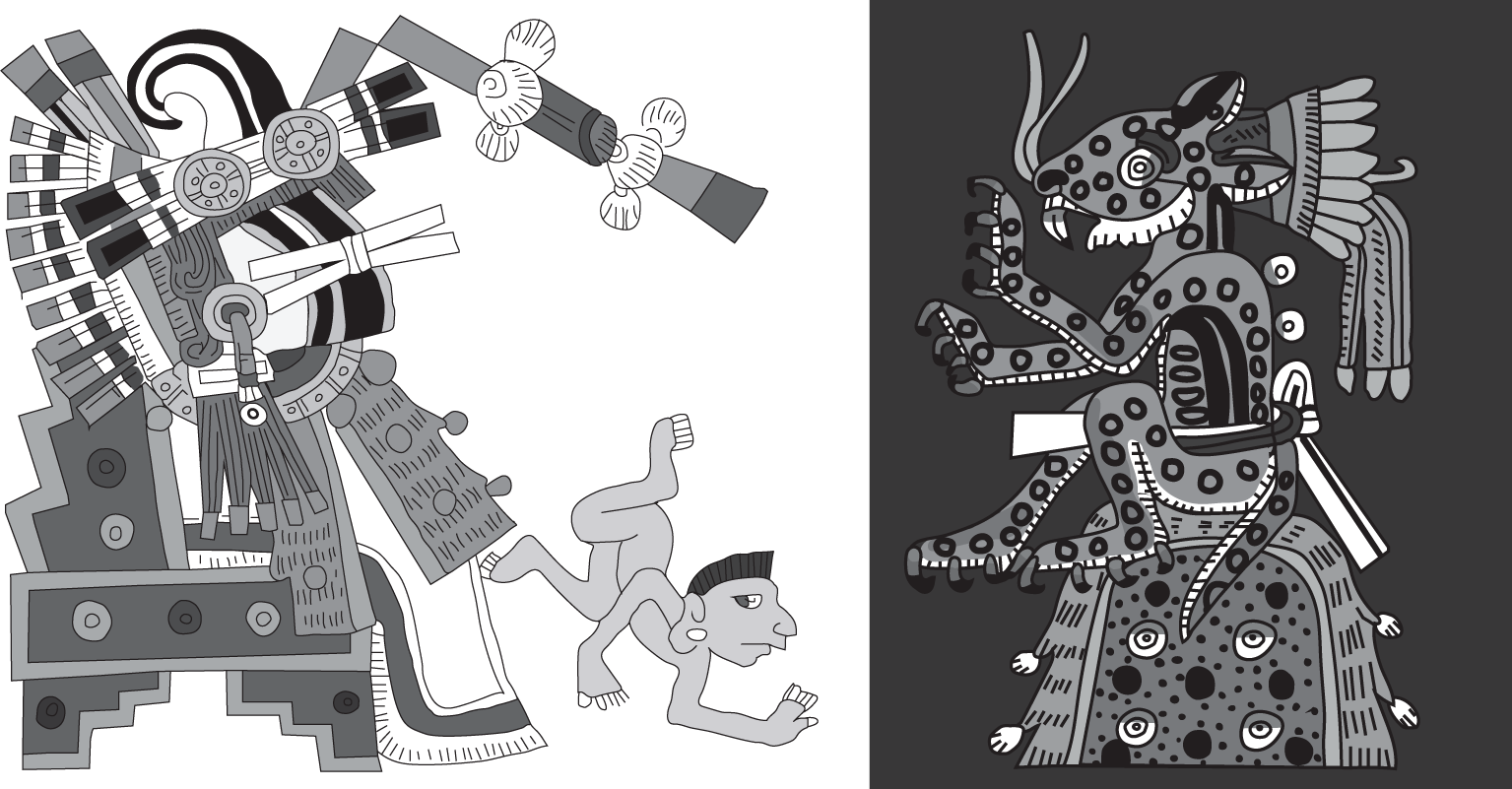 Avatars of Tezcatlipoca: (1) Ixquimilli and (2) Tepeyollotl (Adapted from Codex Borgia).