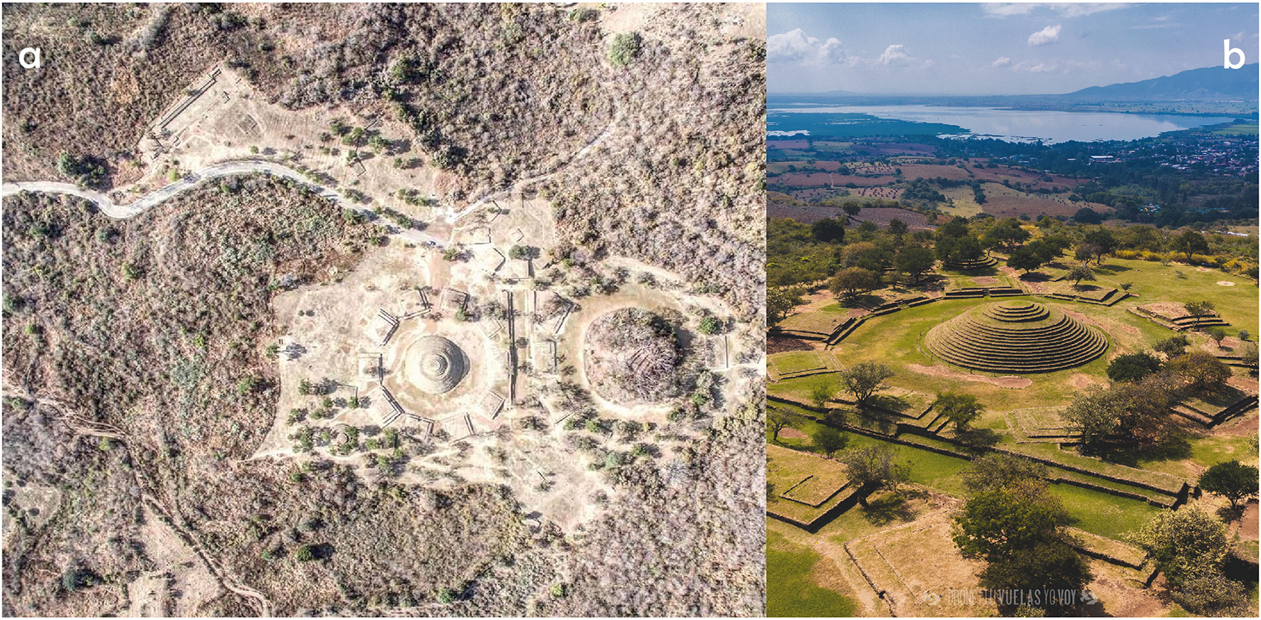 Aerial view of guachimontones and a ballcourt (a) at the Los Guachimontones site (photograph courtesy of Sebastian Albachens). Landscape view of Los Guachimontones' main civic ceremonial area (b) looking south toward the de La Vega dam (photograph courtesy of Lic. María Ramírez Ramírez and Dra. Estefanía Hurtado Llanes @DroneTuVuelasYoVoy 01.11.2020).
