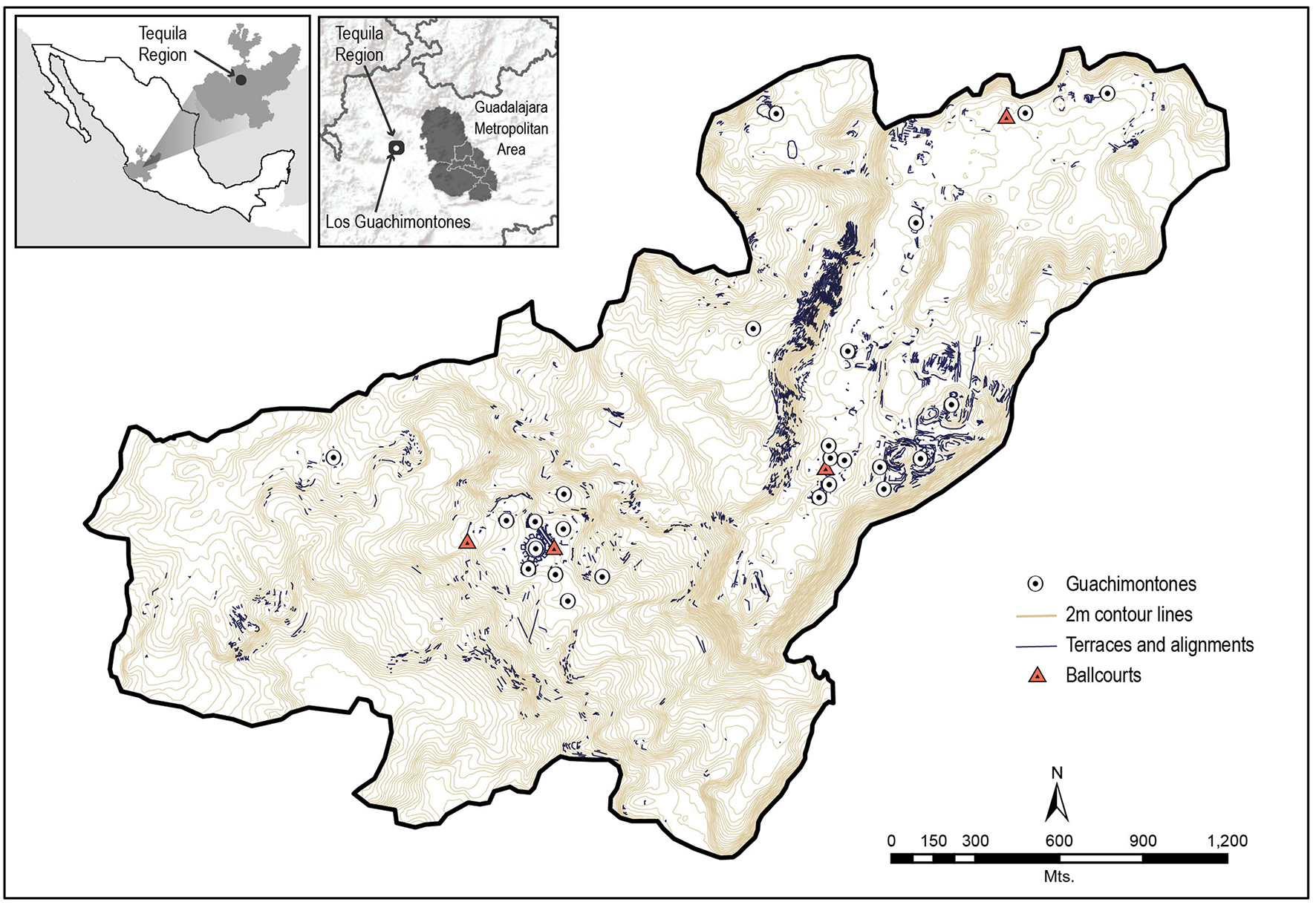 For most readers, ancient Mexico was the land of the Aztecs, Maya, and, perhaps, Olmecs, Zapotecs, and Mixtecs (Figure 1). The area around Tequila, in contrast, conjures up images of a famous alcoholic beverage, for the indigenous culture that evolved in this region is not so well-known. What we call Teuchitlán society was centered in the Tequila region (Figure 2). Its material trademarks, which turn up repeatedly as a set in the architectural record, are shaft tombs, patio groups, ballcourts, and circular platform complexes called guachimontones (Figure 3). There is evidence of intensive agricultural practices (e.g., terracing and raised fields) and craft specialization (e.g., obsidian) from excavations and surveys, both older and more recent. To date we have surveyed thousands of square kilometers in search of ancient sites (Weigand, 1996; Anderson et al., 2013; Heredia Espinoza, 2017).