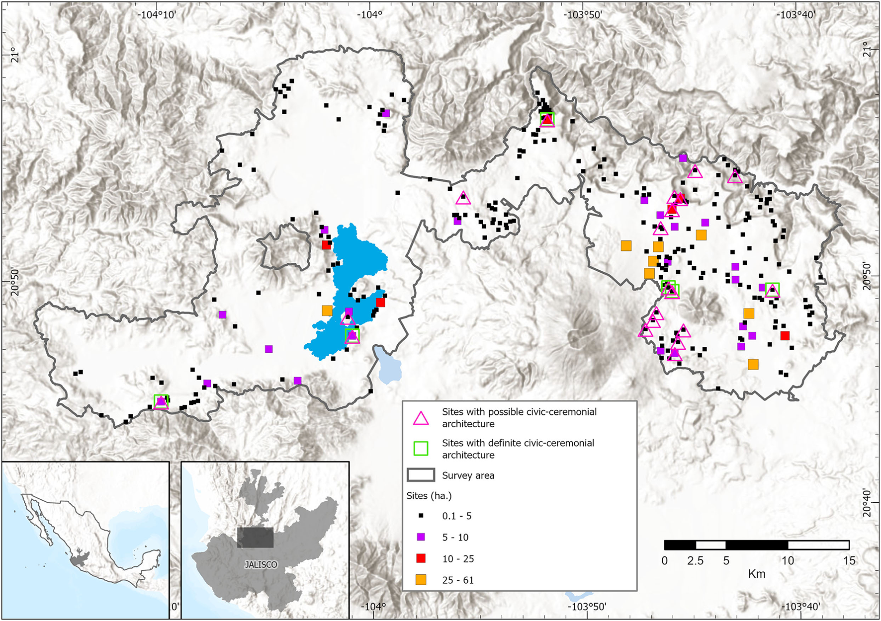 New architectural forms, such as rectangular, “L”-, and “U”-shaped structures come on stage. Sunken or enclosed patios, typical of nearby regions in Mesoamerica, also make the scene (Beekman, 1996; Weigand, 2015, p. 57). Significantly, the form of civic-ceremonial architecture changed from round to rectangular or square structures. In the surveyed area, 20 sites contain special types of architecture (e.g., L- or U-shaped structures, enclosed patios, large platforms supporting multiple structures), but only six have multiple buildings or edifices substantial in volume and scale (Figure 6). The largest two are in the southern Magdalena basin (Ocomo and San Juanito 03). They have large platforms that support multiple structures and enclosed patios (for Ocomo see Smith Márquez, 2018). The platform at Ocomo supported a large, enclosed space surrounded by several structures. Its architectural plan resembles the Mexica palaces of central Mexico a few centuries before European arrival (Weigand, 1993, pp. 147–148). Both sites extend for six hectares, taken up mostly by the platforms. The other four sites have modest architecture ranging from 270 to 1,500 m2. The question of how much authority these centers wielded in the region is still unexplored, but the settlement pattern around them is light and there are no large concentrations of people, indicative of a ruralized, deurbanized landscape (Figure 6).