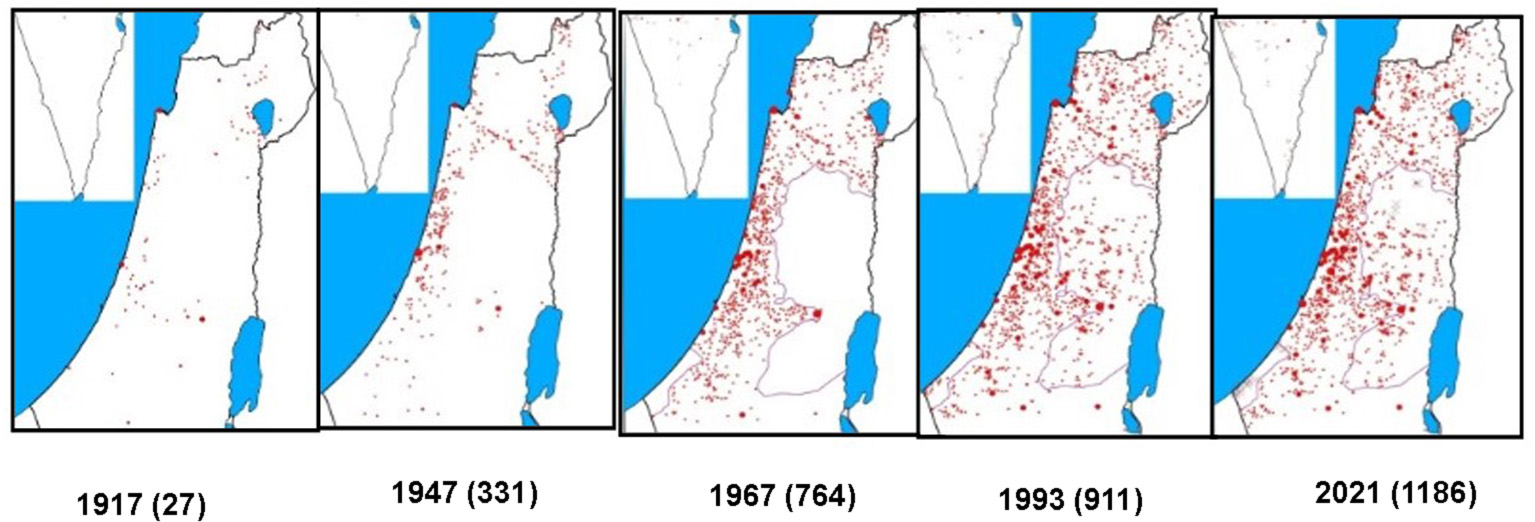 Jewish settlement in Palestine/Israel 1917–2021 showing number and location of settlements.