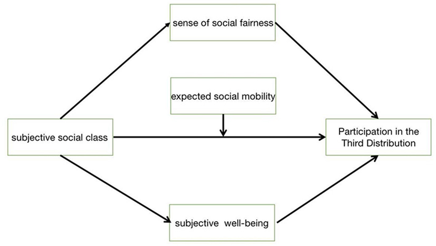 It has been argued that the two inconsistent findings mentioned above are likely due to the neglect of the moderating role of social mobility (Tan et al., 2019). An individual's decision-making process for a behavior includes the expectation of the outcome (Wang et al., 2012), and subjective social mobility in the individual cognition tends to influence the individual's perceptions and attitude (Li, 2016; Zhang, 2016). It has been shown that expected reward plays a moderating role between social class and prosocial behavior; and individuals' expectations about behavioral outcomes would influence the relationship between social class and prosocial behavior: the prosocial behavior of low-social-class individuals is largely influenced by expected reward, and in the unrewarded context, individuals in lower social classes have less prosocial behavior than high-social-class individuals (Wilson, 2000; Lu et al., 2014). It can be inferred that individuals will be more active in the Third Distribution if they believe participation will help them reach a higher social class. Therefore, this paper explores the relationship between social class and attitude to participate in the Third Distribution in a dynamic perspective of subjective social mobility. The following hypothesis is proposed: