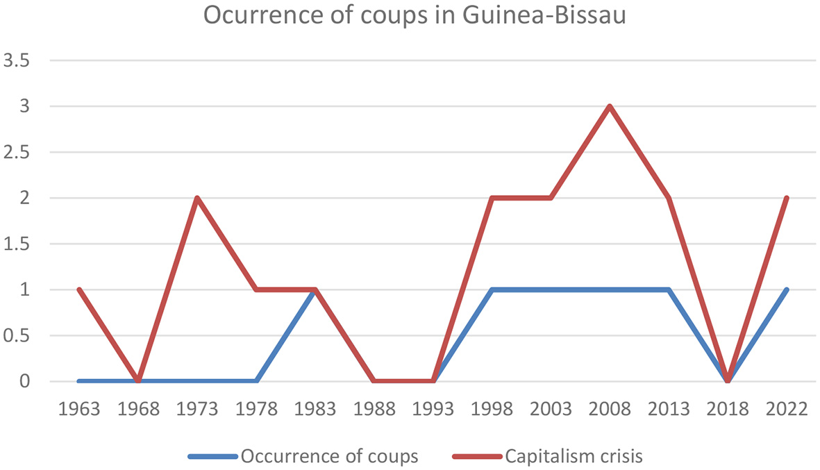 I will try to show that there is a pattern of coups matching capitalism crisis. See Table 1 and Figure 1.