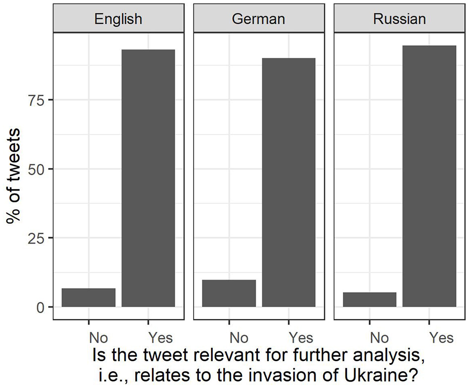 To address our research questions, we used an open-access dataset of tweets in English, Russian, and German that included the hashtag or keyword “Ukraine.” We posit that the language differences in the subsamples correspond to distinctions between language communities, yet we acknowledge that these subsamples may not provide a clear-cut representation of the perspectives of various nationalities or affiliations. The data was gathered by Münch and Kessling via the Twitter Academic API and published on 1 March 2022 to support open science (Münch and Kessling, 2022). We accessed the repository and rehydrated3 its content for the time range from 1 February to 31 May 2022, which allowed us to analyze the portrayal of NATO during the onset of the full-scale Russian invasion of Ukraine. The initial datasets contained several million tweets per language (English N = 23,384,107; German N = 7,395,587; Russian N = 1,808,828), making sample preparation and quality control a significant undertaking. Following the methodological advice of Grundmann (2022) that the exclusion of duplicate texts is needed to reduce noise, we decided to remove all duplicates and exclude all retweets (see also Silge and Robinson, 2017, for this approach on Twitter data). We decided to keep all tweets with unique text content, regardless of whether they were copy-pasted messages or had slight alterations, as long as they tagged different politicians or NGOs with @-mentions. This decision ensured that our results were not biased by deleting tweets that could have been part of a coordinated action by activists, which has been shown to be a strategy to bring attention to the invasion. For instance, Maikovska and Canevez (2023) investigated how pro-Ukrainian activists coordinated in Telegram channels to implement this strategy to circulate content on social media such as Twitter.