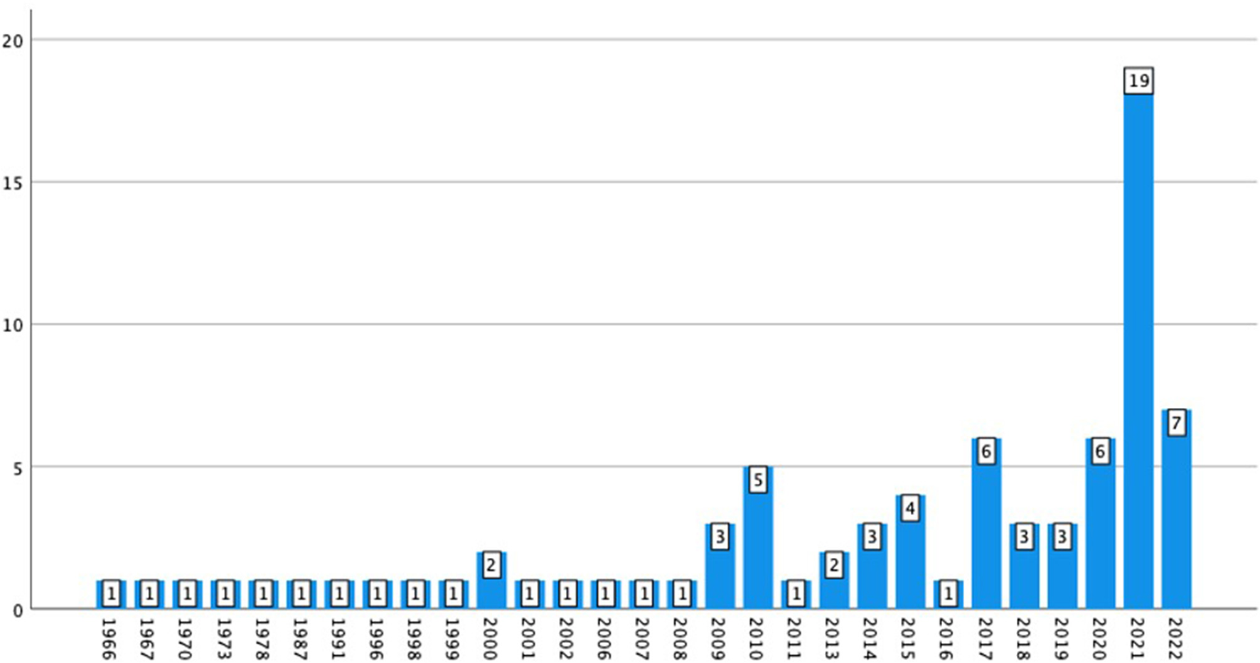 This section briefly discusses the basic descriptives of the sample of articles that were included in the dataset. First, we map the evolution of the publication of studies over time. Figure 2 shows a strong upward trend in the number of articles on the issue. It is clear that the relationship between deliberation and polarization has gained increasing attention over time. The bulk of studies on the issue were published after 2010 (60 out of 80 studies, or 75%), and this coincides with the empirical turn in deliberative democracy (Dryzek, 2010). However, what is especially striking is that no less than 26 studies (or 32.5% of the total) were published in the last two years.