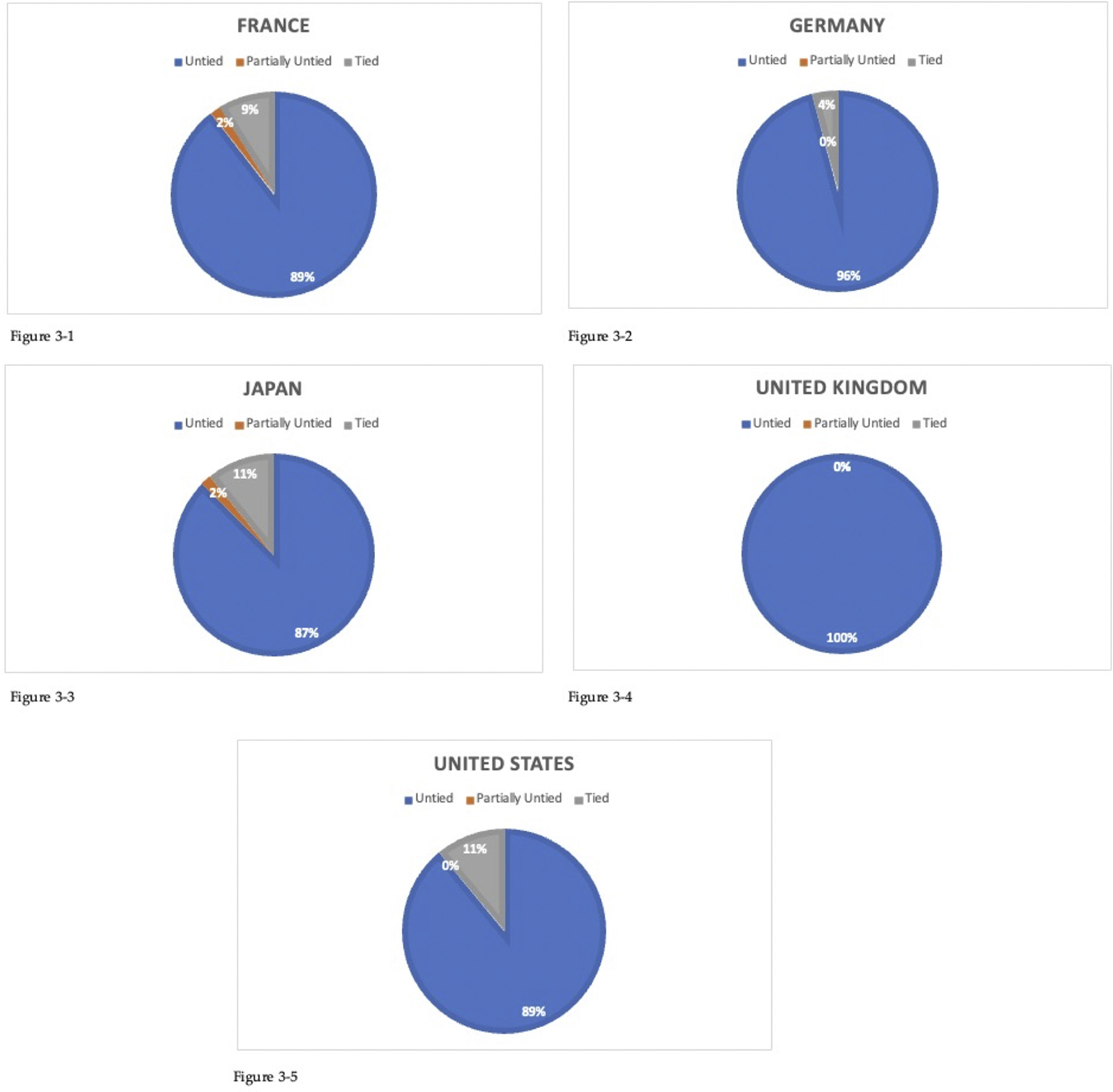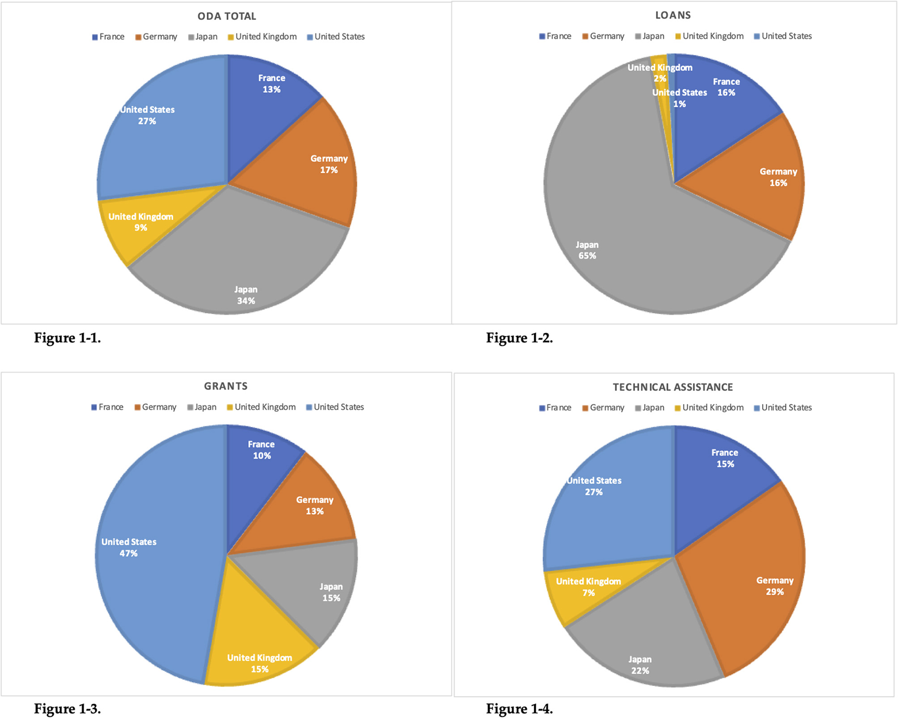 During the study period, ODA from the 5 donor countries accounted for 51% of the total ODA from all donors to the 63 recipient countries covered by this study. The data covered by this estimation is 56% of France's ODA, 55% of Germany's ODA, 69% of Japan's ODA, 39% of UK's ODA, and 39% of the US's ODA from 1996 to 2020. Figure 1 shows the percentage of each donor country for each form of ODA.