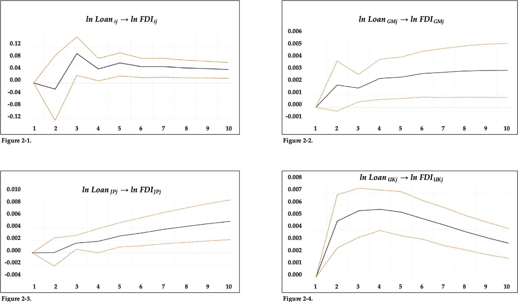 As Gravity models identify explained variables in accordance with theory, they have the drawback of being relatively arbitrary. Panel VAR models that are relatively less arbitrary were used to compensate for this shortcoming. Additionally, the VAR model examined only the types of ODA that were significant in the GMM estimation. Granger causality tests was performed to verify causal relationships using panel VAR models. Impulse response analyses and variance decomposition analyses also used to describe how much ODA influences FDI.