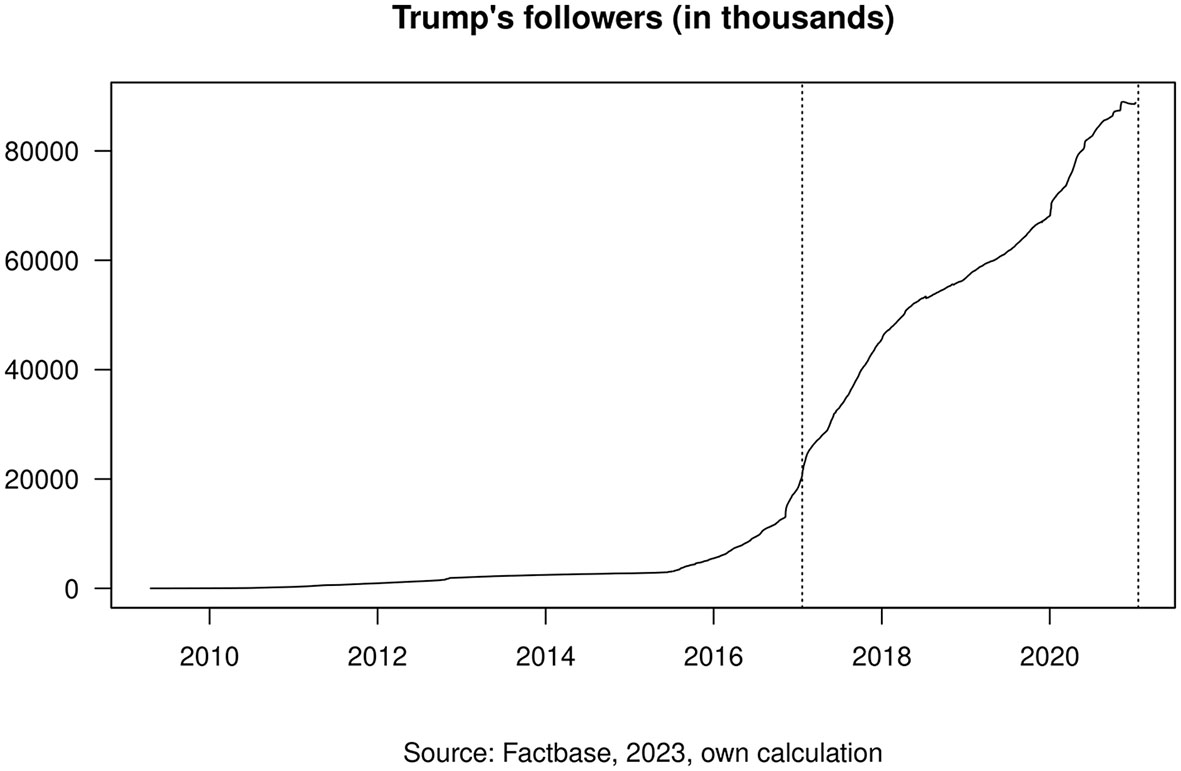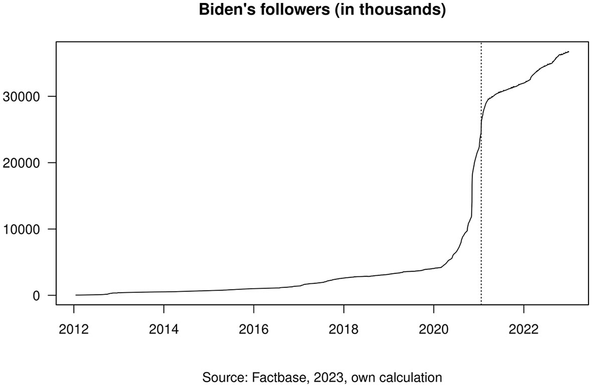 As previously discussed, one of the strongest signals of acclamation when it comes to social media networks such as Twitter is the question, who follows whom. Unfortunately, Twitter does not provide data on the development of Twitter followers over time via its API. But for the accounts of Donald Trump (@realDonaldTrump) and Joe Biden (@JoeBiden), we find data gathered daily (Factbase, 2023). Unfortunately, the same data for Barack Obama is missing.