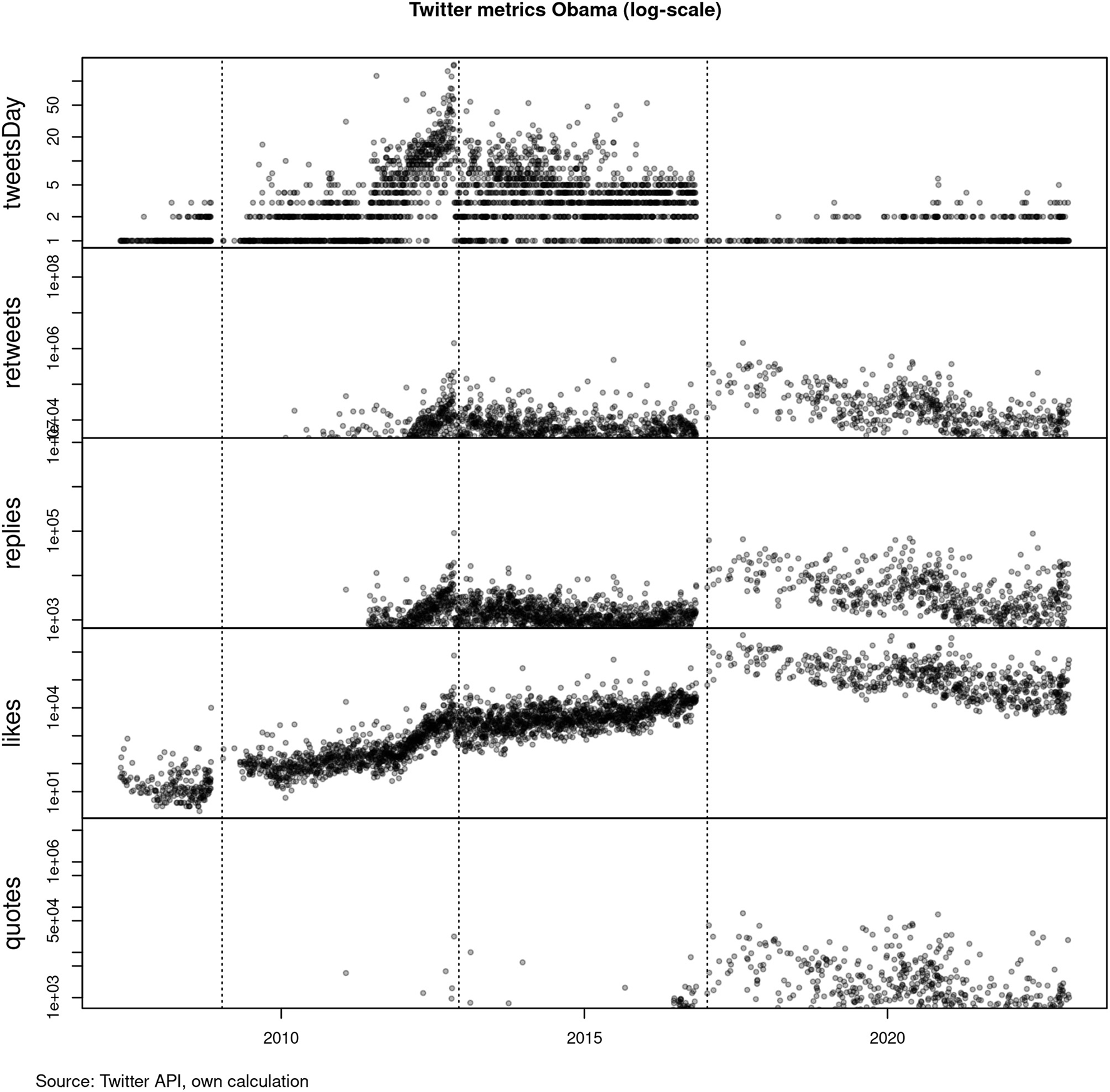 Twitter provides many channels for acclamation in the sphere of communication. From the Academic Twitter API, we collected all the tweets of Barack Obama (@BarackObama) and Joe Biden (@JoeBiden). Because Trump was banned by Twitter, we cannot access his data via the API so we have taken archived data from the platform Kaggle (2023), which leads to a slightly different data structure. These data are used to display the development of likes, retweets, quotes, and replies by the presidents over time.