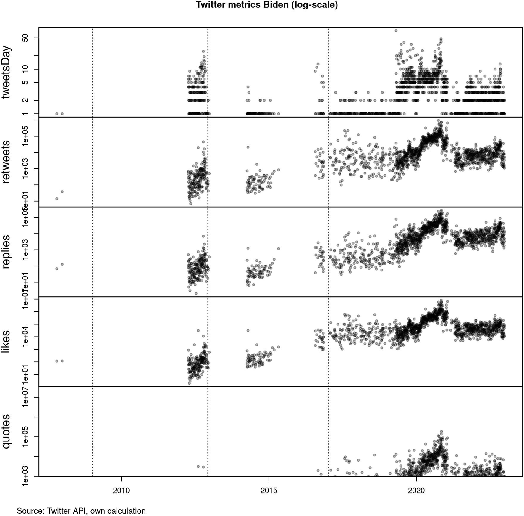 As discussed above, Twitter provides many channels for acclamation in the sphere of communication. From the Academic Twitter API, we collected all the tweets of Barack Obama (@BarackObama) and Joe Biden (@JoeBiden). Because Trump was banned by Twitter, we cannot access his data via the API so we have taken archived data from the platform Kaggle (2023), which leads to a slightly different data structure. For Obama and Biden, we can calculate for each day the number of tweets (sent by the account), number of retweets, number of replies, number of likes, and number of quotes. Figures 3, 4 show this data for Obama and Biden. All plots are transferred to a log scale, taking into consideration the typical log-normal distribution of social media content. The periods of the presidency are marked again with dashed lines. For Obama (Figure 3), we see that the periods of presidency clearly divide the data. He was most active on Twitter when he was running for the second time as president and his activity went down substantially when Trump took over the office. Retweets and replies—which are signs of acclamation—were on a very high level during his second period in office. As Hegelich and Shahrezaye (2015) have shown, replies might be linked to negative acclamation as well. The most direct form of acclamation, likes, shows a very interesting pattern. During his time in power, Obama's daily likes grew exponentially (linear on the log scale). Staying in power seems to have a positive effect on the number of acclamation actions of “the people” (which here is of course only the virtual crowd on Twitter). For Obama, we can also see what happens to acclamation after his time as president. Despite being less active, he reaches in all categories a new—and constant—level of acclamation. This shows that all the likes and retweets are not linked to his actual political importance and the political information his account provides. Instead, it seems that he has reached a new level of glory. As discussed above, this can be connected to the concept of the empty thrown: “The apparatus of glory finds its perfect cipher in the majesty of the empty throne. Its purpose is to capture within the governmental machine that unthinkable inoperativity—making it its internal motor—that constitutes the ultimate mystery of divinity” (Agamben, 2011, p. 245). The moment Obama steps down from the throne and becomes a normal person again, worshiping his Twitter account becomes a powerful reminiscence of the divine leadership the crowd is expecting from their king—and which many think the then-new president (Trump) is not worthy of.
