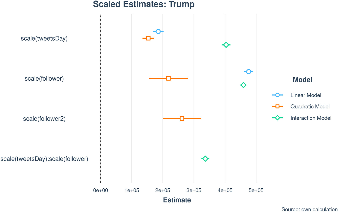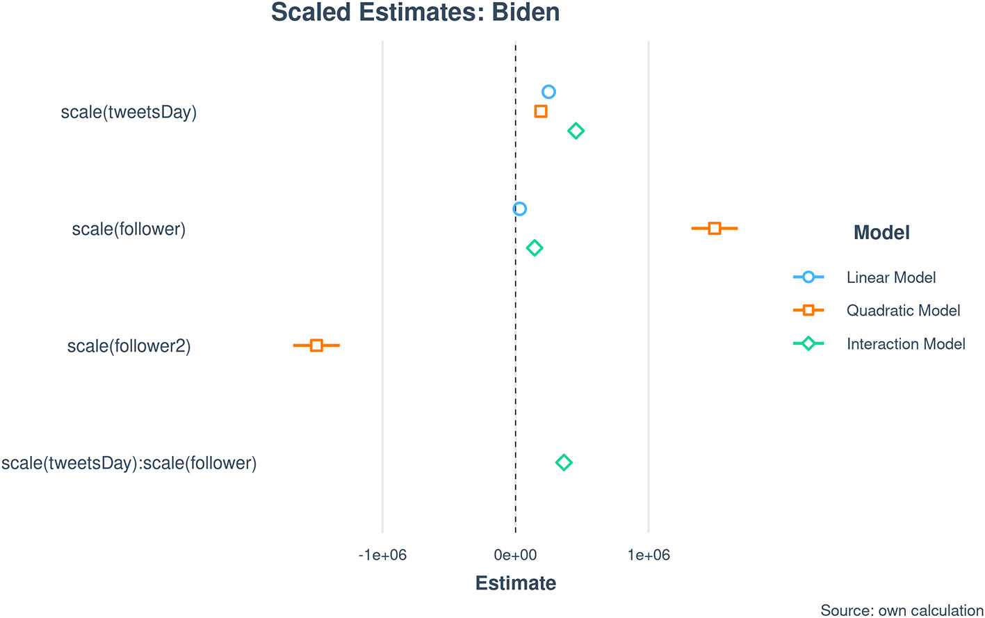 After scaling the dependent variables in the models, we can compare the effects (Figure 6). Due to scaling, the effect of followers in model 3 appears now as a positive number, but this is only due to the new mean and should not be confused with a change of the effect. What we can see here is that the quadratic number of followers has the strongest effect in all models and the effect is negative. This strengthens our argument that the Twitter algorithm does not work in favor of Biden's acclamation measured in likes.